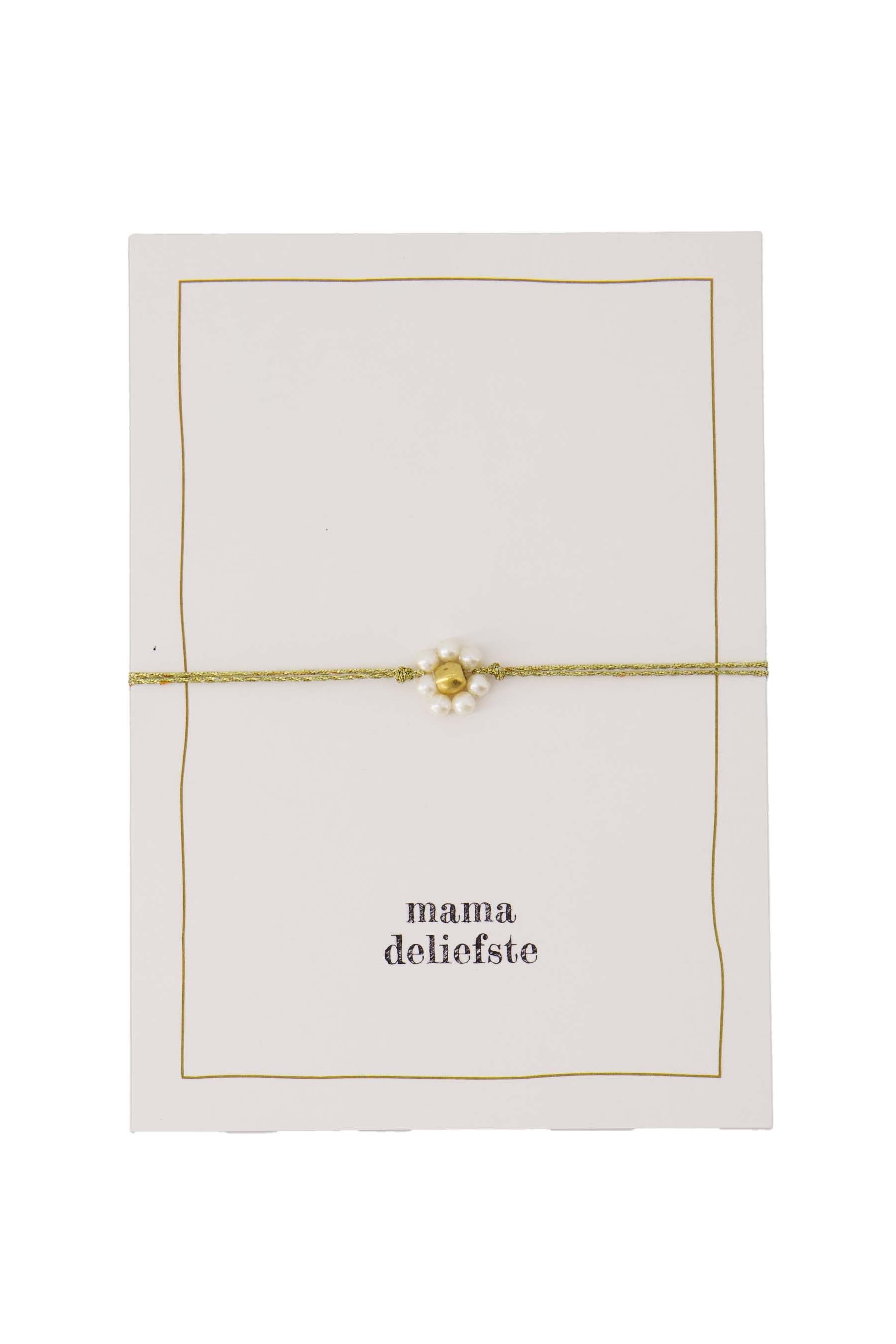Dit Zusss armbandje voor mama straalt warmte uit en is een mooi gebaar voor de liefste mama. Met een fijn goudkleurig draadje en een subtiel bloemvormig sierelement van kleine pareltjes en een gouden kraal, past dit armbandje perfect bij iedere stijl. Het armbandje wordt geleverd op een ansichtkaart met de lieve tekst ‘mama deliefste’. Het is een charmant cadeautje dat emoties zachtjes omsluit en een dagelijkse herinnering is aan jouw liefdevolle band met mama.