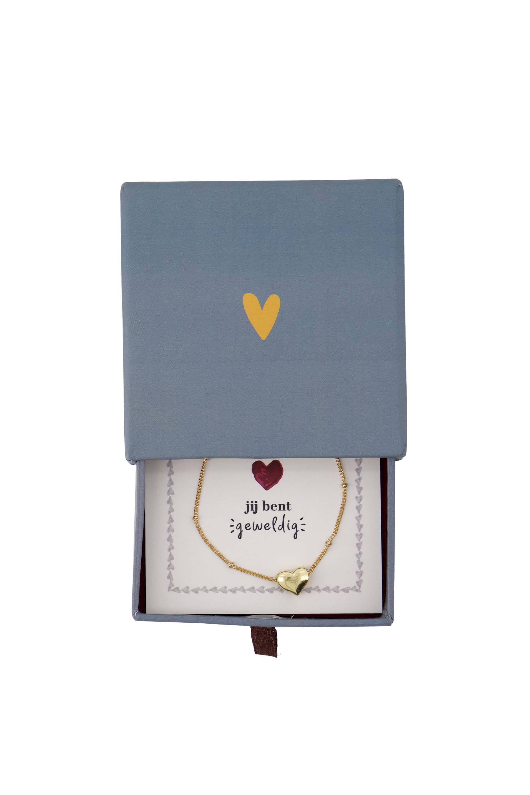 This Zusss bracelet with heart in cute sliding box is a subtle and warm accessory. The bracelet has a fine gold chain with a small, shiny heart, wrapped in a cute gray-blue box. The Zusss bracelet with heart gives a personal touch and is perfect to give as a gift or surprise yourself with it. Thank you to the box, the bracelet remains nicely protected and ready for any moment. This jewelry fits nicely in the collection of fashion accessories.