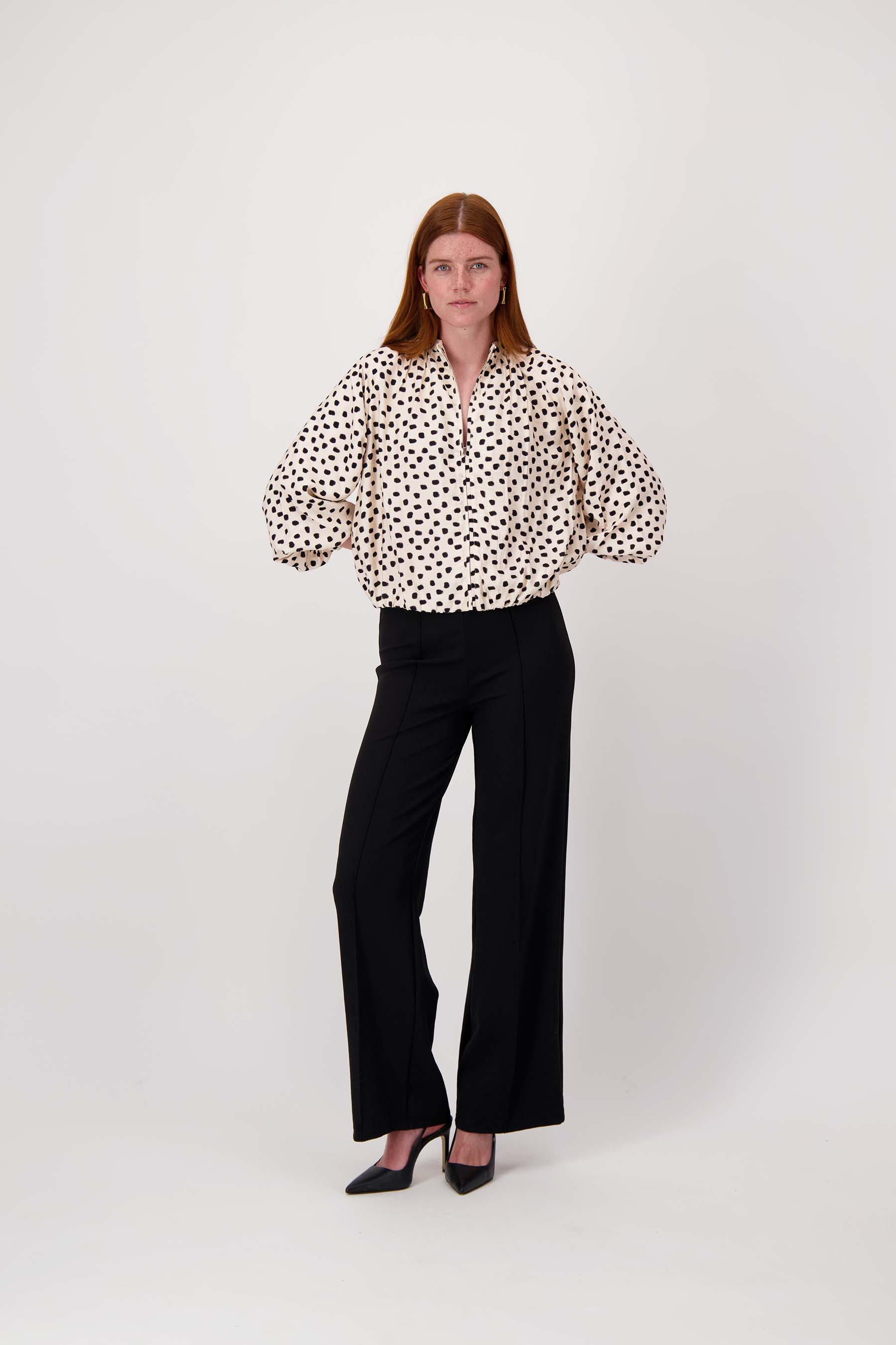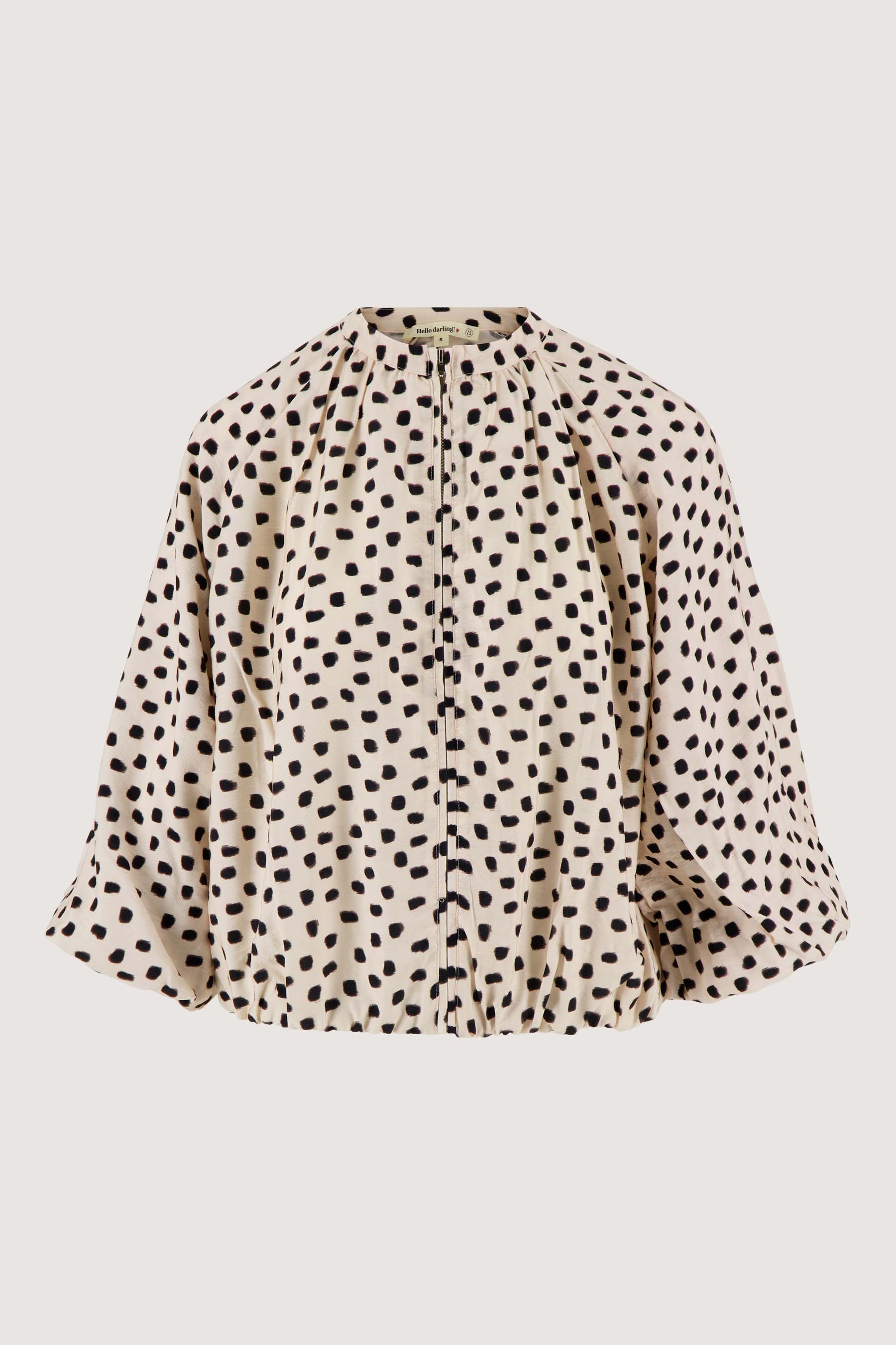 The Zusss balloon bomber jacket with polka dot print is a stylish must-have for your wardrobe. This jacket stands out thanks to its striking off-white color with black dots, which create a playful effect. The balloon shape creates an airy, feminine look and makes the jacket very comfortable. The bomber jacket has a zipper at the front and three-quarter sleeves, perfect for a casual or chic outfit. Pair this bomber jacket with polka dot print with one of our pants to complete your outfit.