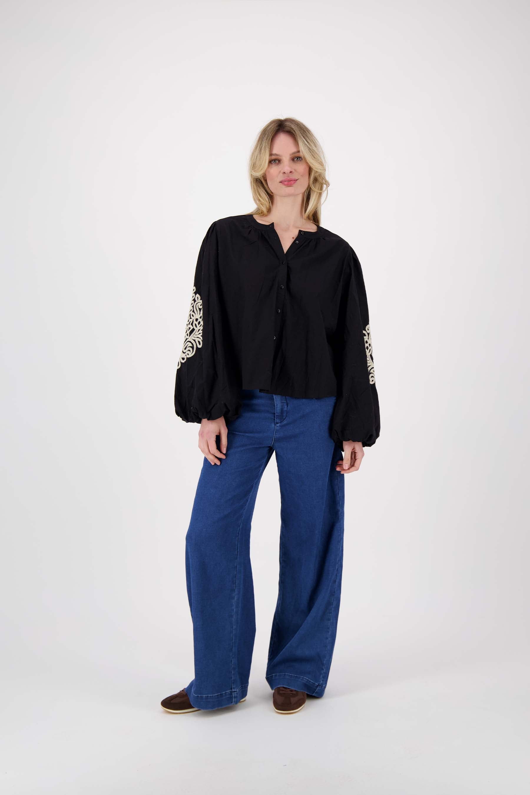 This blouse with embroidery sleeves from Zusss is a fine addition to your wardrobe. The blouse with embroidery sleeves has a soft, black color and a comfortable fit with slightly pleated details at the neckline. The eye-catching embroidered accents on the sleeves add that extra bit of charm. Pair this blouse with embroidery sleeves effortlessly with your favorite pants or skirt for a casual, yet special look.