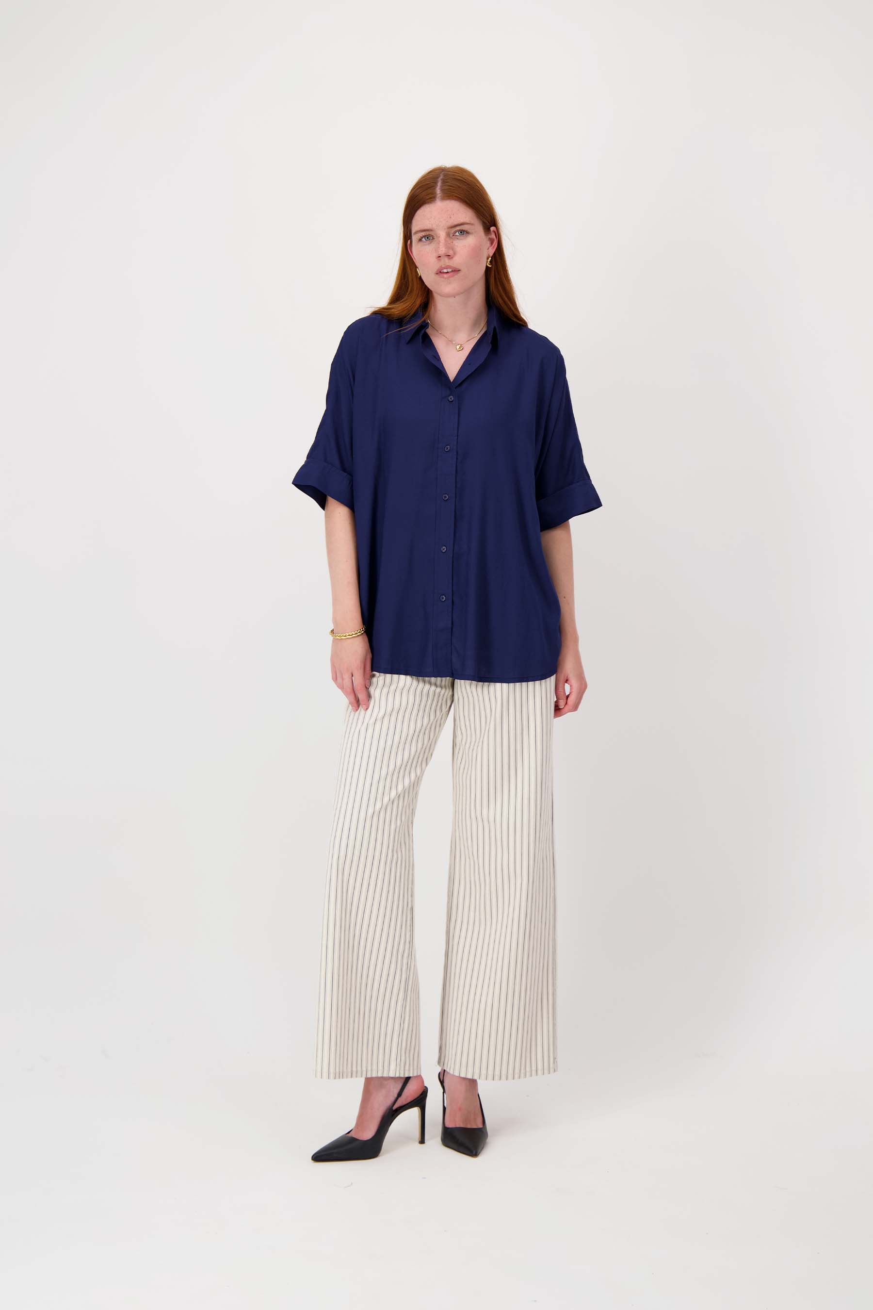 De Zusss blouse in boxy model is een perfecte keuze voor een lichte en luchtige zomeroutfit. Deze blouse in de kleur summer navy heeft een losse pasvorm met korte, omgeslagen mouwen en een knoopsluiting aan de voorkant. De blouse straalt een ontspannen maar toch verzorgde uitstraling uit, ideaal voor diverse gelegenheden. De navy kleur maakt het makkelijk te combineren met uiteenlopende kleuren en stijlen. Combineer de blouse met een van onze jeans voor een stoere look.