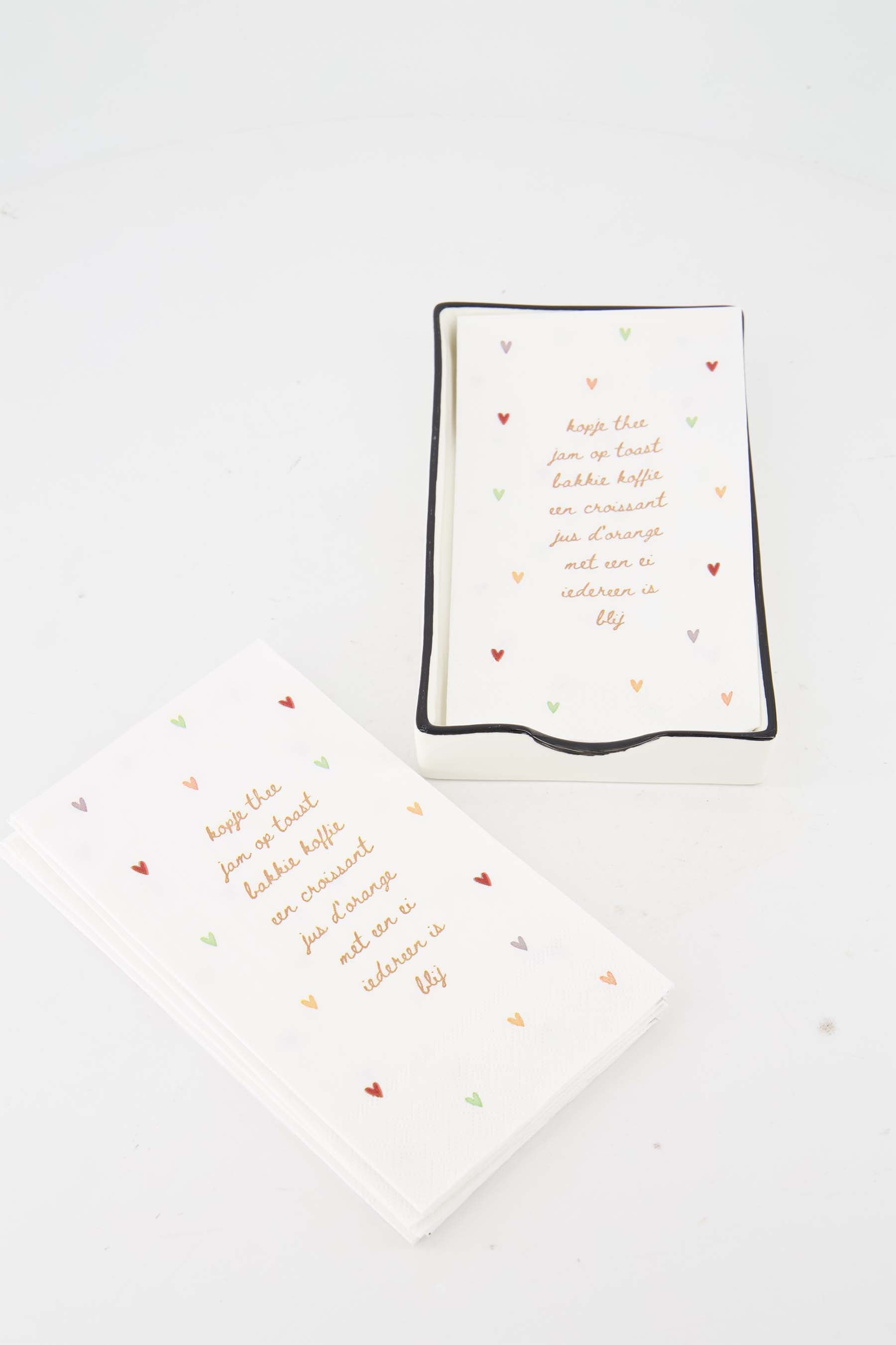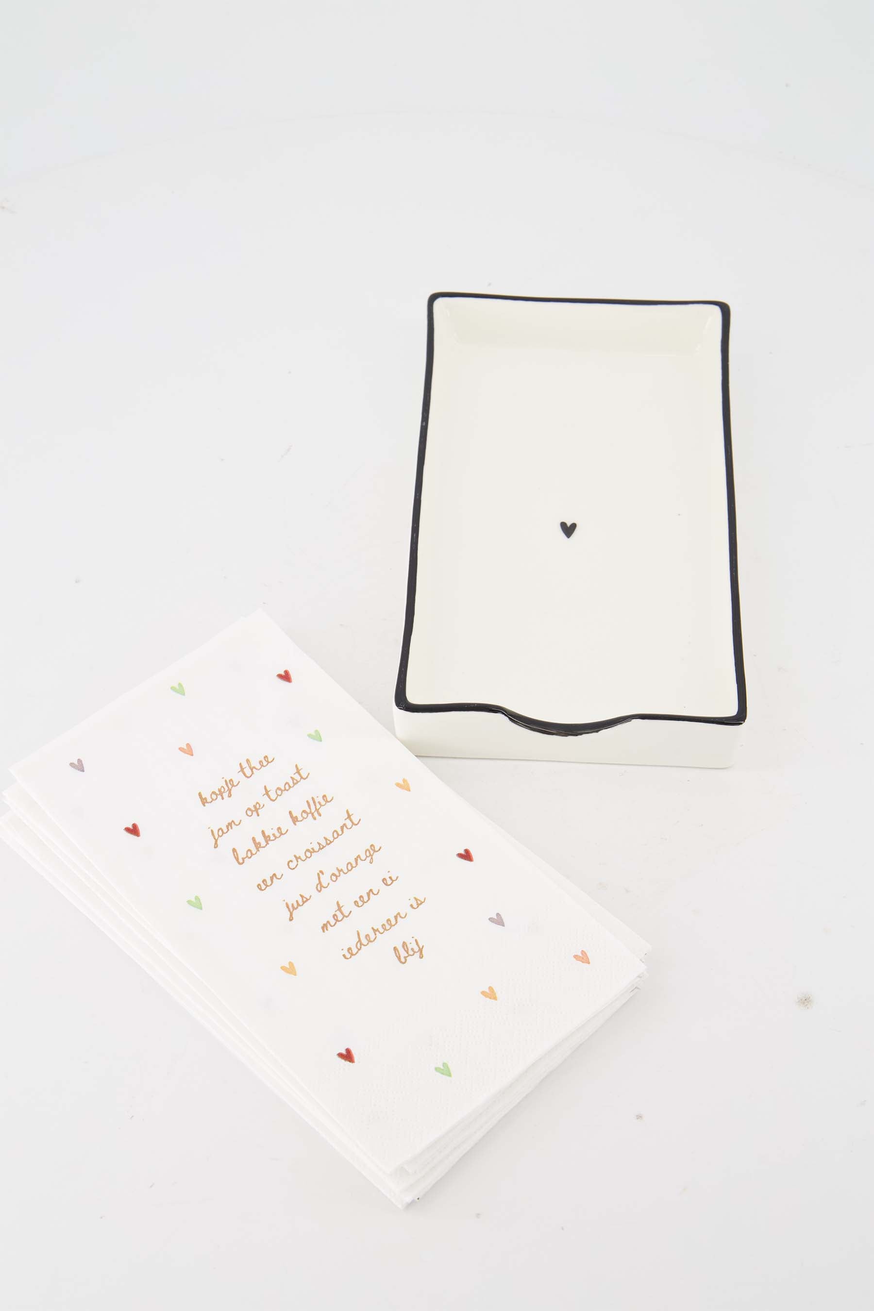 Servetten en servethouder van Zusss maken jouw tafelsetting helemaal af. Deze servetten en servethouder set bestaat uit een keramische servethouder in zachte wittint met zwart randje en een subtiel hartje in het midden. De bijpassende servetten zijn versierd met kleine gekleurde hartjes en een lieve tekst. Perfect voor een gezellig etentje, lunch of koffiemoment. Met deze servetten en servethouder geef je jouw tafel nét dat beetje extra sfeer. Combineer met items uit onze kitchen & dining room of ontdek meer in home decor.