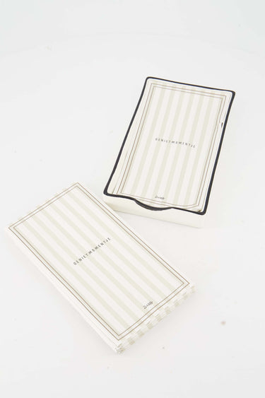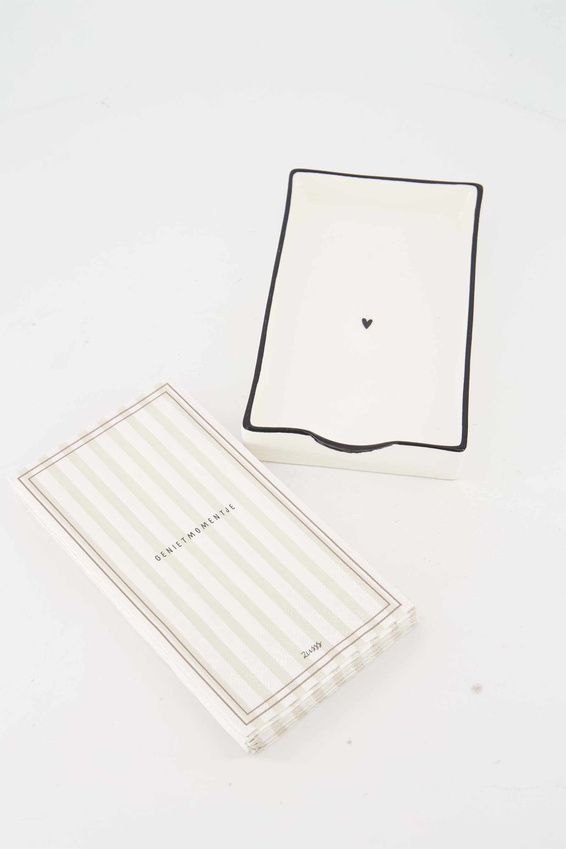 Servetten en servethouder van Zusss geven jouw tafel een rustige, stijlvolle uitstraling. Deze servetten en servethouder set bestaat uit een keramische houder in zachte wittint met zwart randje en een klein hartje. De servetten hebben fijne strepen in naturel tinten met de tekst “genietmomentje”. Perfect voor een lunch, diner of koffiemoment. Met deze servetten en servethouder creëer je eenvoudig een sfeervolle tafel. Combineer met items uit onze kitchen & dining room.
