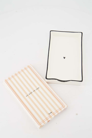 Servetten en servethouder van Zusss geven jouw tafel een warme, vrolijke uitstraling. Deze servetten en servethouder set bestaat uit een keramische houder in zachte wittint met zwart randje en een klein hartje. De servetten hebben fijne strepen in zachte perzik- en naturel tinten met de tekst “jij bent zo leuk”. Perfect voor een brunch, lunch of gezellig diner. Met deze servetten en servethouder maak je ieder tafelmoment nét wat specialer. Combineer met items uit onze kitchen & dining room.