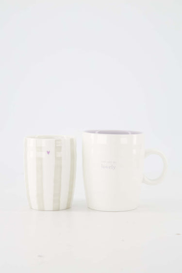 Met deze koffiemok en theemok lovely van Zusss geniet je van een stijlvol duo voor koffie en thee. De koffiemok zonder oor heeft subtiele verticale strepen en een klein lila hartje. De theemok met oor is uitgevoerd in zacht wit met een lila binnenkant en de tekst “you are so lovely”. Deze koffiemok en theemok lovely vormen samen een rustige, elegante set voor elk moment van de dag. Mooi om te combineren met items uit onze kitchen & dining room of om cadeau te geven. Ontdek meer in onze gifts.