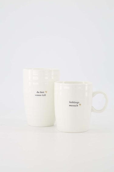 Deze mok L en theemok lieblingsmensch van Zusss vormen samen een liefdevolle set. De mok L heeft de tekst ‘du bist sooo toll’ met een subtiel hartje. De theemok draagt de tekst ‘lieblingsmensch’, ook met een klein hartje. Beide mokken zijn uitgevoerd in een zachte crème tint en gemaakt van stevig keramiek. Perfect voor een gezellig koffie- en theemoment samen. Ook mooi om cadeau te geven aan iemand die jij extra wilt verrassen. Combineer met items uit onze kitchen & dining room collectie.