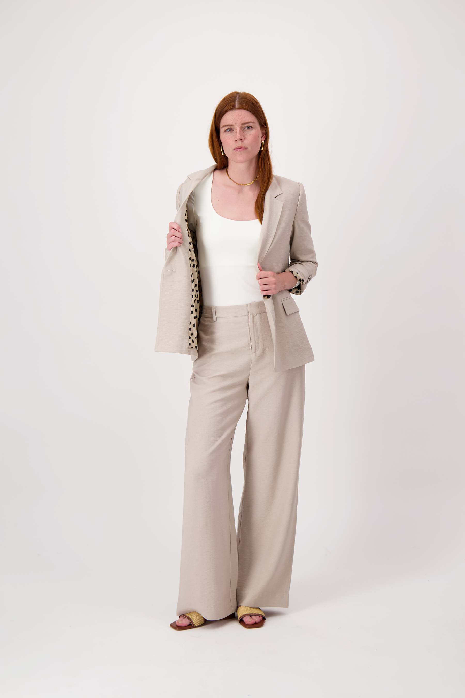 This Zusss women's blazer with roll-up sleeves is a timeless must-have. The blazer exudes casual elegance thanks to its soft sand color and subtle fabric texture. The sleeves can be rolled up stylishly, adding a playful touch to your outfit. With a single button closure and neat pockets, this blazer is perfect for a variety of styles and occasions. The Zusss blazer with roll-up sleeves adds comfort and style to your wardrobe. Pair the women's blazer with one of our trousers or wide-leg pants for the perfect look.