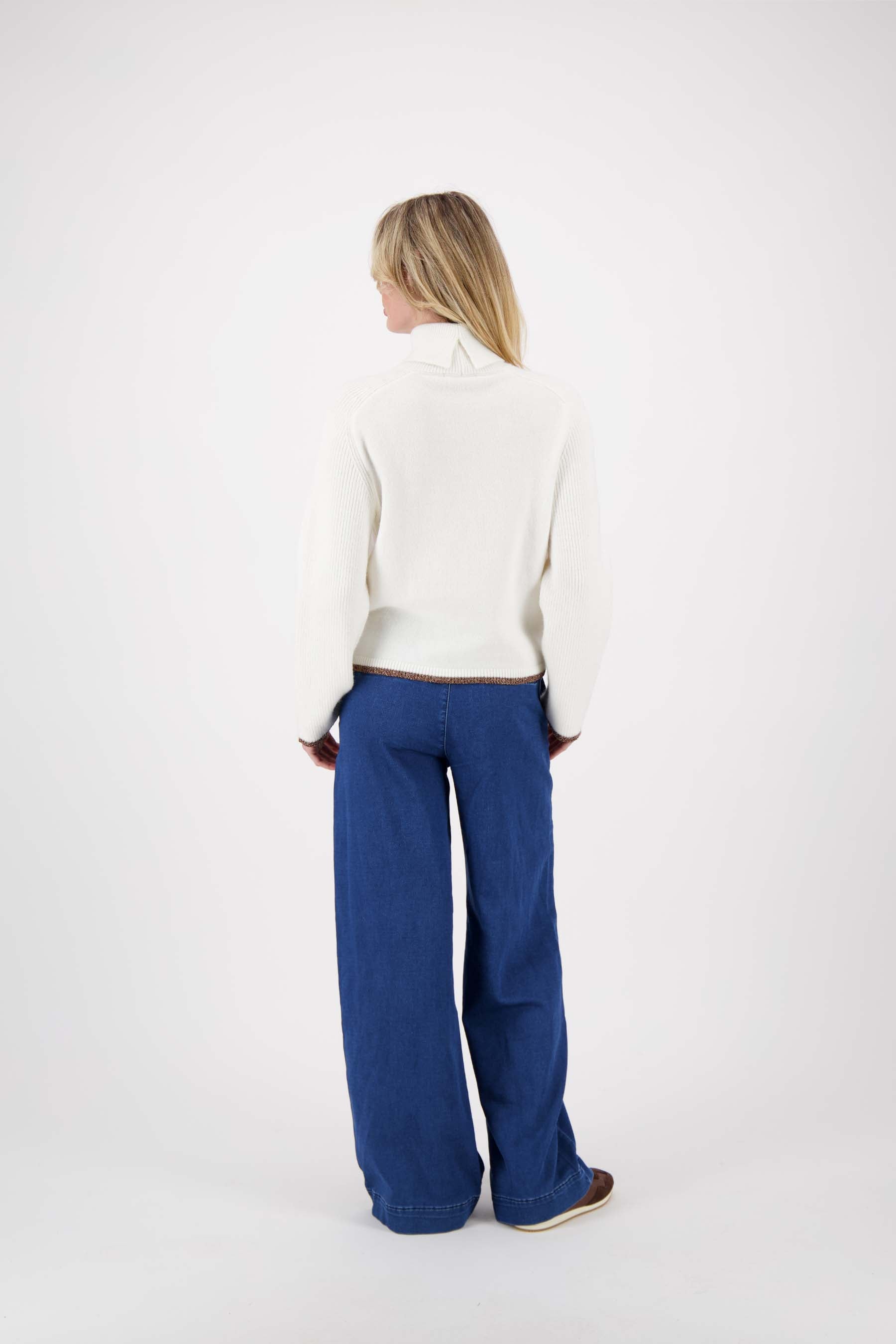 This turtleneck with colored border from Zusss is perfect for cool days. The turtleneck combines the soft off white with a subtle contrast color on the collar, which gives it a playful touch. Thanks to the fine structure it is wonderfully comfortable and is easy to combine with your favorite pants or skirts. The turtleneck with colored border is a timeless basic you don't want to miss this winter.