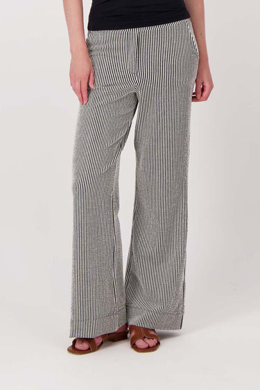 The Zusss textured striped pants are a stylish choice for any wardrobe. These pants with an off-white and black striped print drape smoothly and have a comfortable, loose fit. The lightweight material creates a relaxed look with subtle texture, perfect for both casual and more formal occasions. Pair these striped pants with your favorite blouse or top for a versatile outfit.