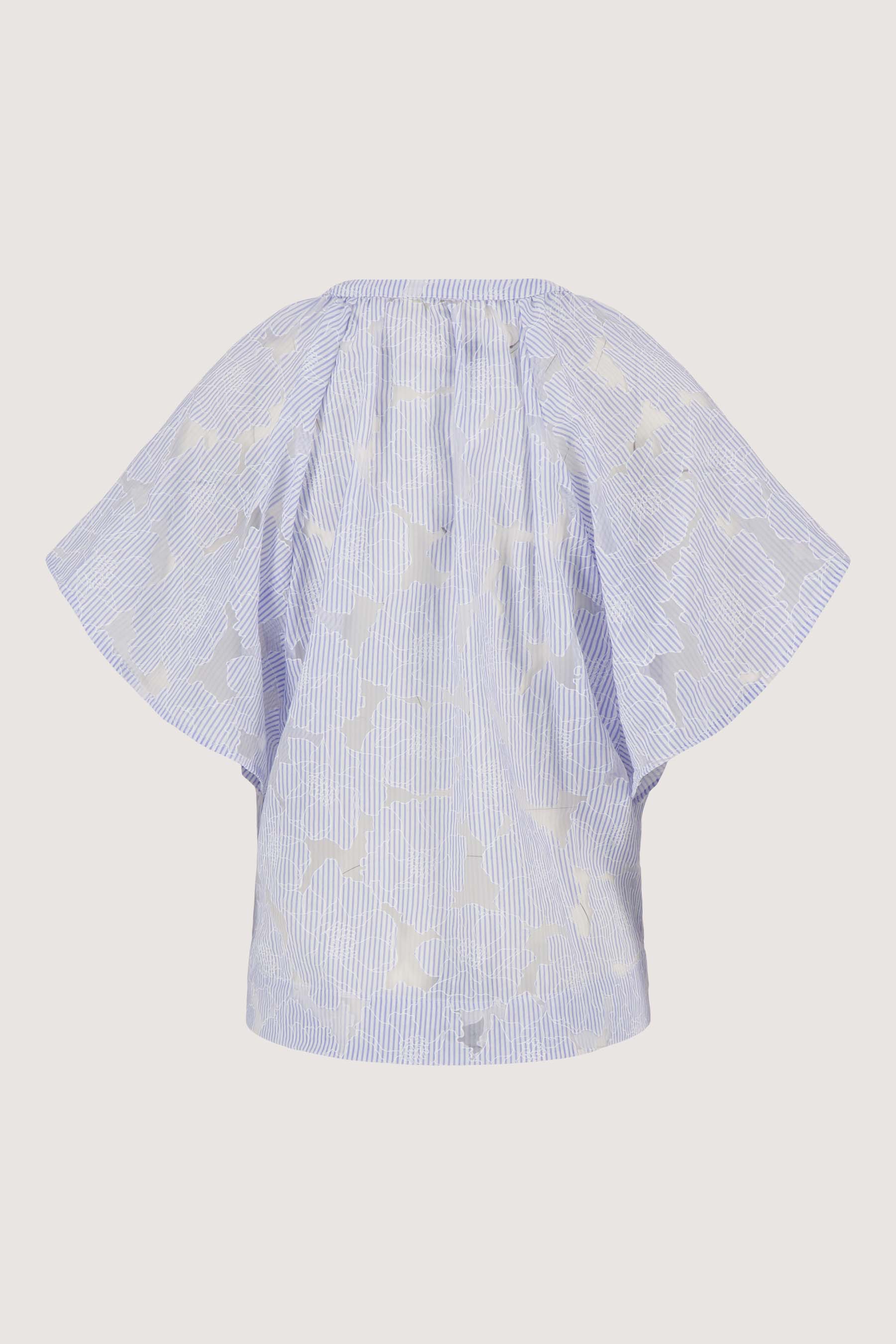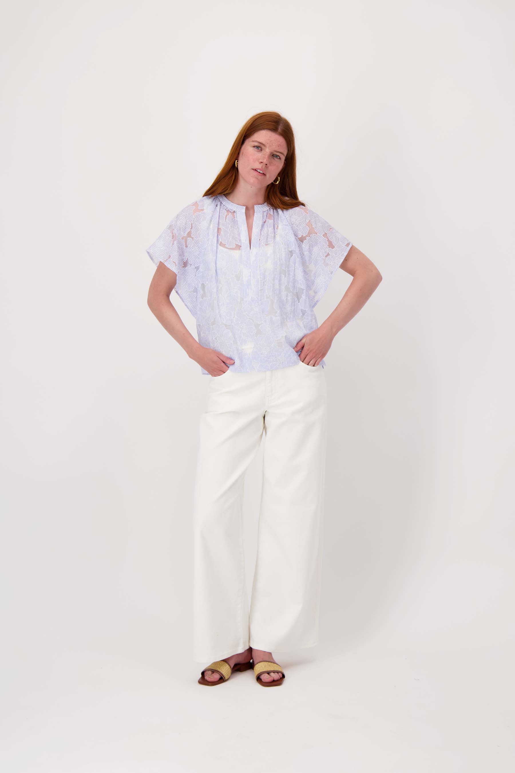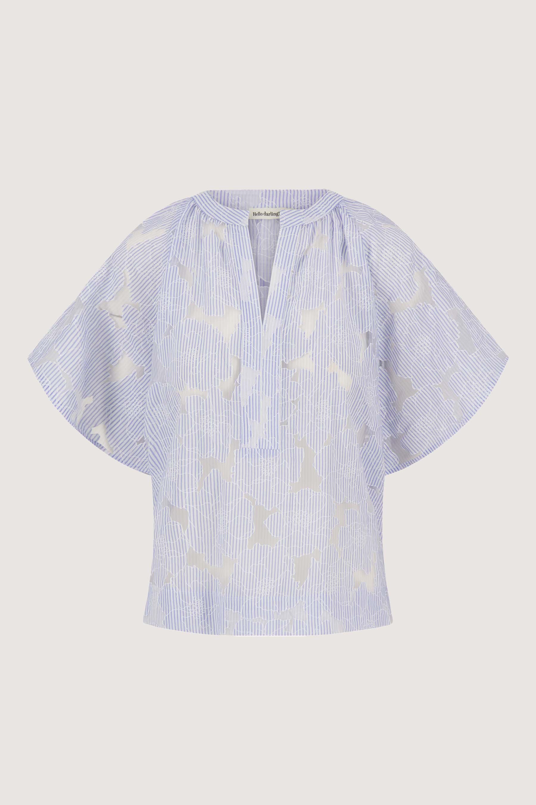 The Zusss striped organza blouse is a real eye-catcher for your wardrobe. This blouse has a light, airy look thanks to the transparent organza with subtle stripes and a mid blue/off-white color scheme. The blouse features short, wide sleeves and an elegant slit at the neckline, perfect for an effortless, stylish look. The blouse is comfortable and a must-have for spring and summer. Pair this look with one of our crossody bags and cute earrings to complete the look.