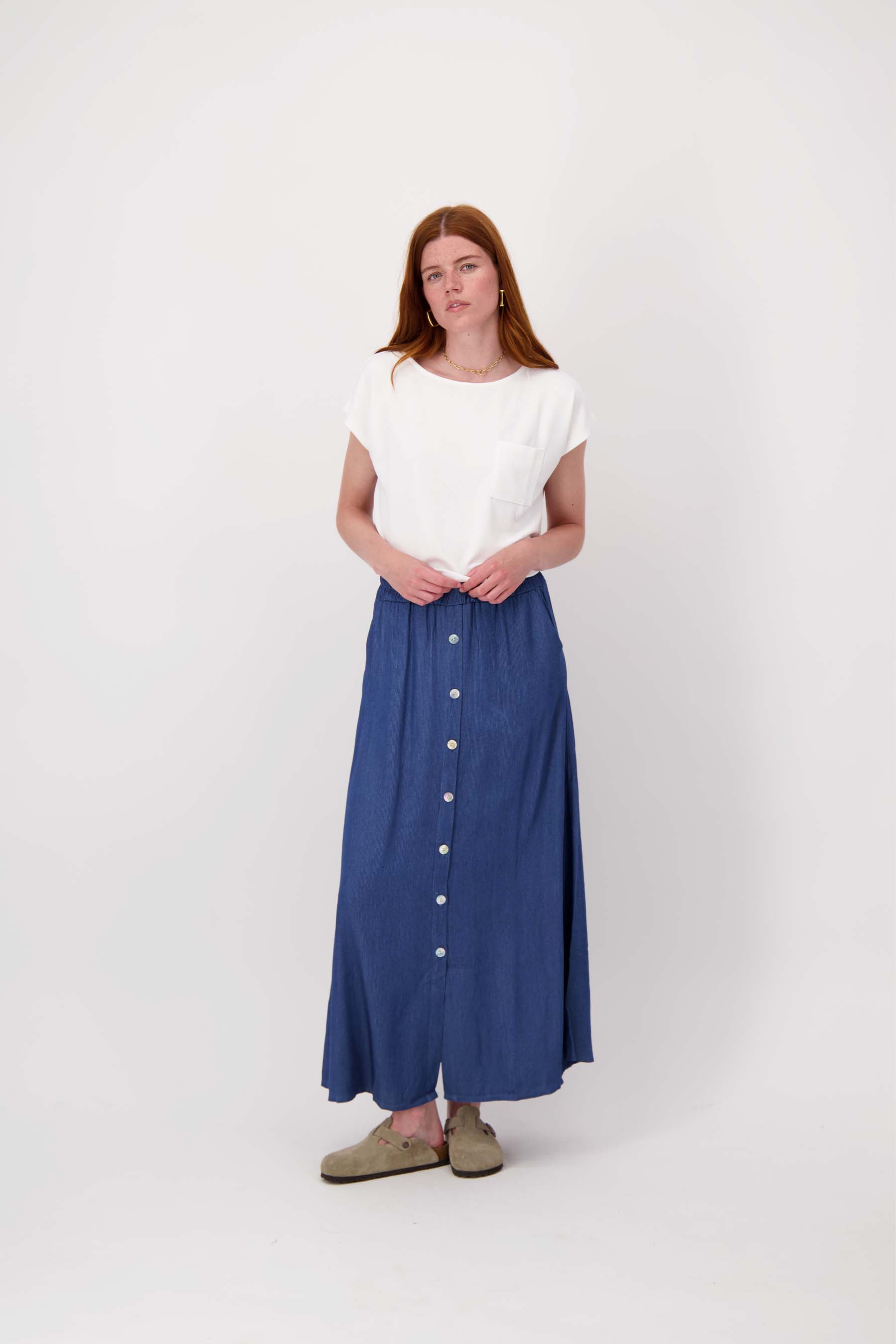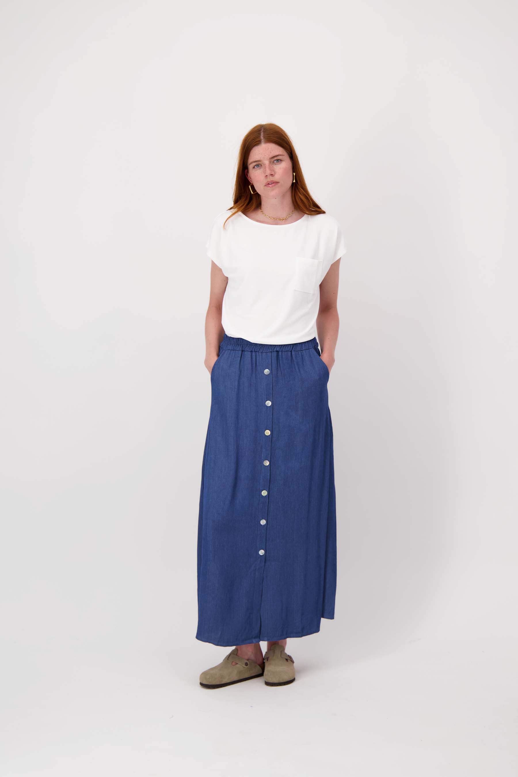 De Zusss denim rok is een comfortabele en stijlvolle musthave voor jouw garderobe. Deze mid blue denim rok combineert moeiteloos casual met chic dankzij de zachte tencel stof. De rok is voorzien van subtiele strepen en een rij knopen aan de voorkant, wat zorgt voor een speels accent. Het elastische taillebandje maakt deze denim rok extra draagbaar en perfect voor iedere dag. Dankzij het lichte en soepelvallende materiaal is deze rok jouw favoriete item voor het hele seizoen. Combineer deze denmin rok met een leuke blouse of top.