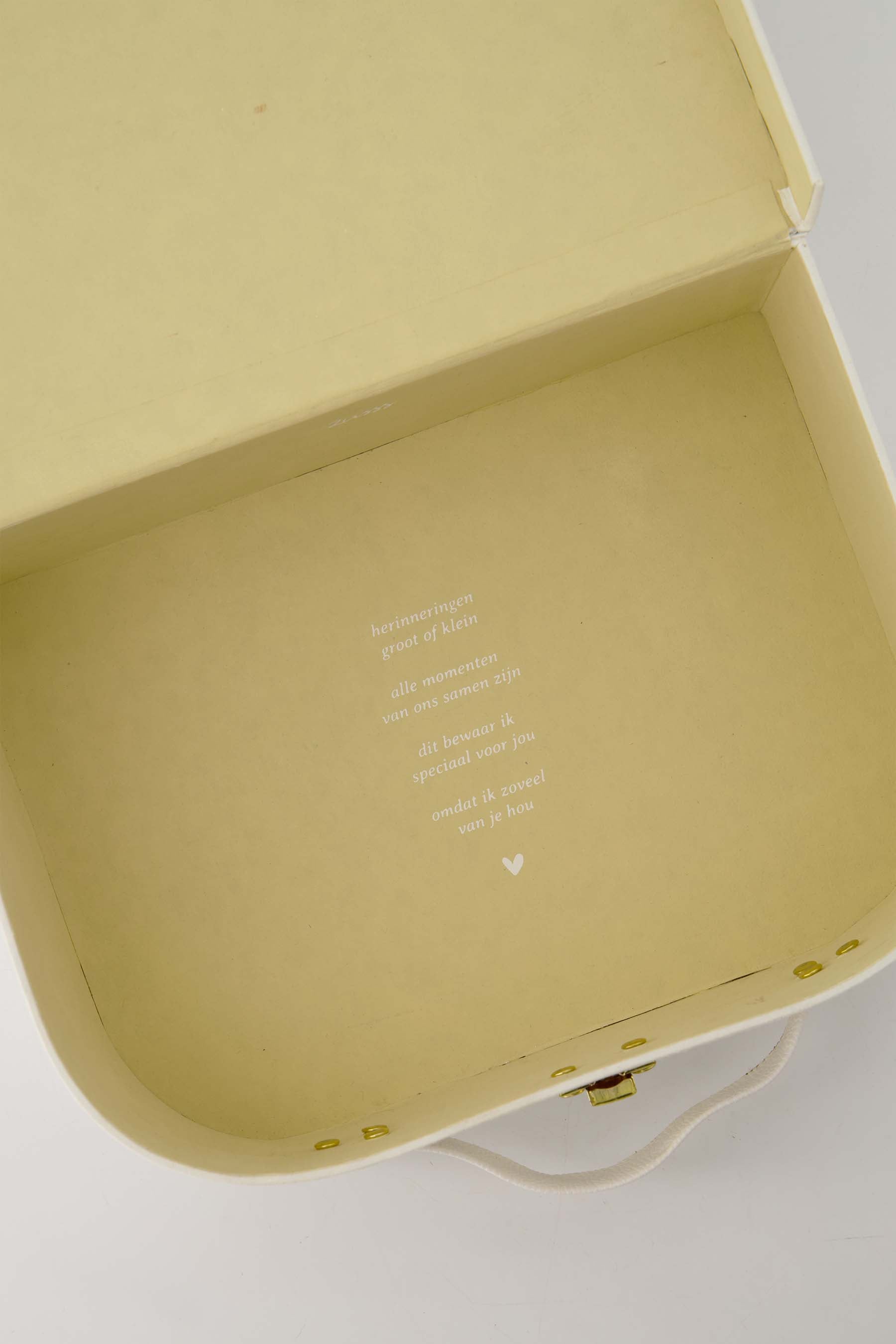 The little cutie memory box from Zusss is perfect for storing precious moments. This memory box in white with sand-colored hearts and a small red heart is made of sturdy cardboard. Measuring 28x20x8 cm, the little cutie memory box is handy and compact. The words 'kleine leukerd' (little cutie) are subtly printed on the front, giving this memory box a playful and sweet character. Discover our home accessories for even more beautiful items.