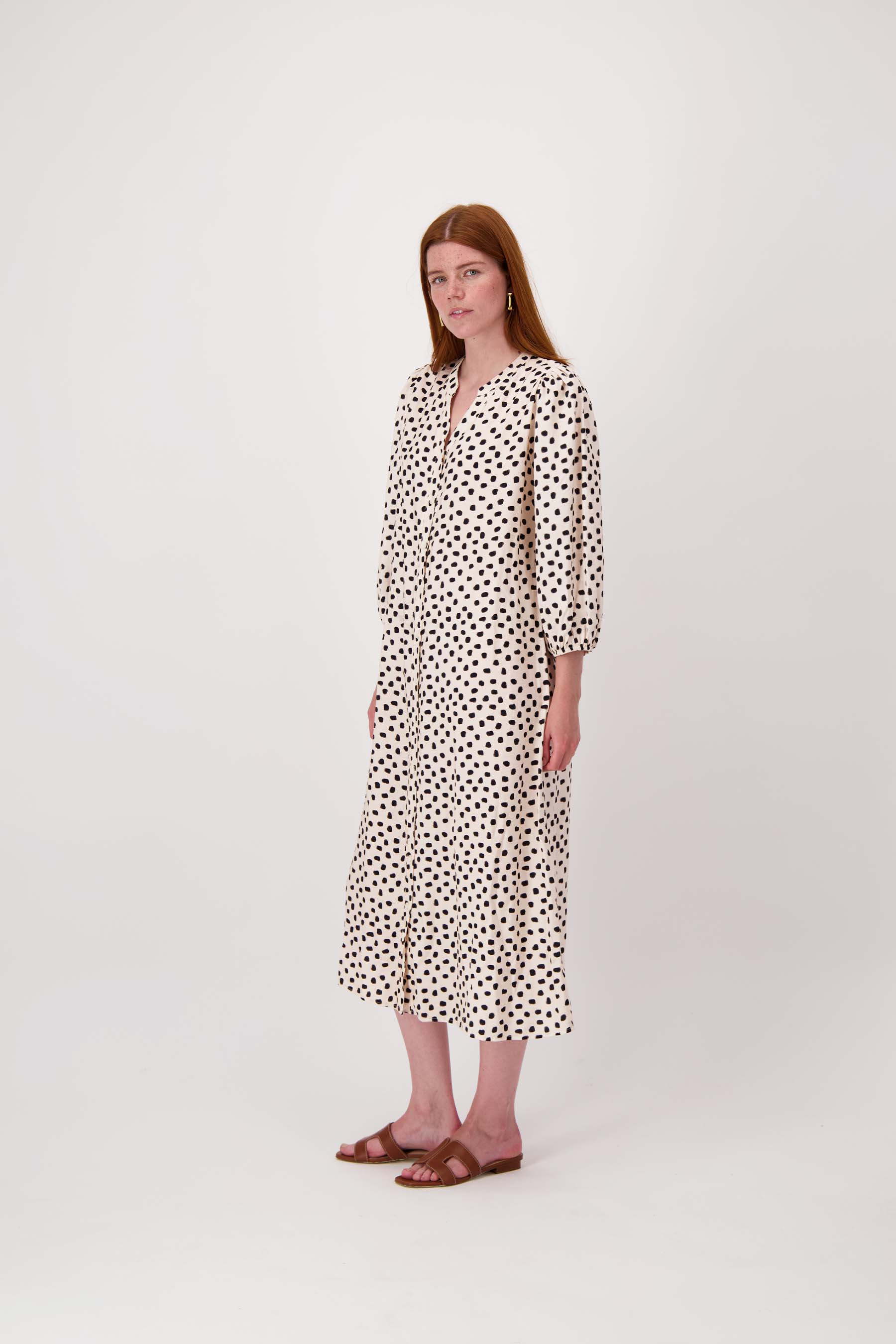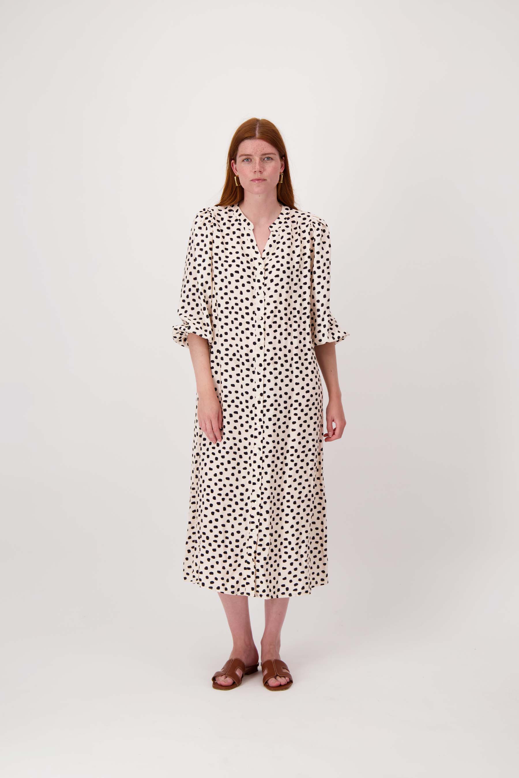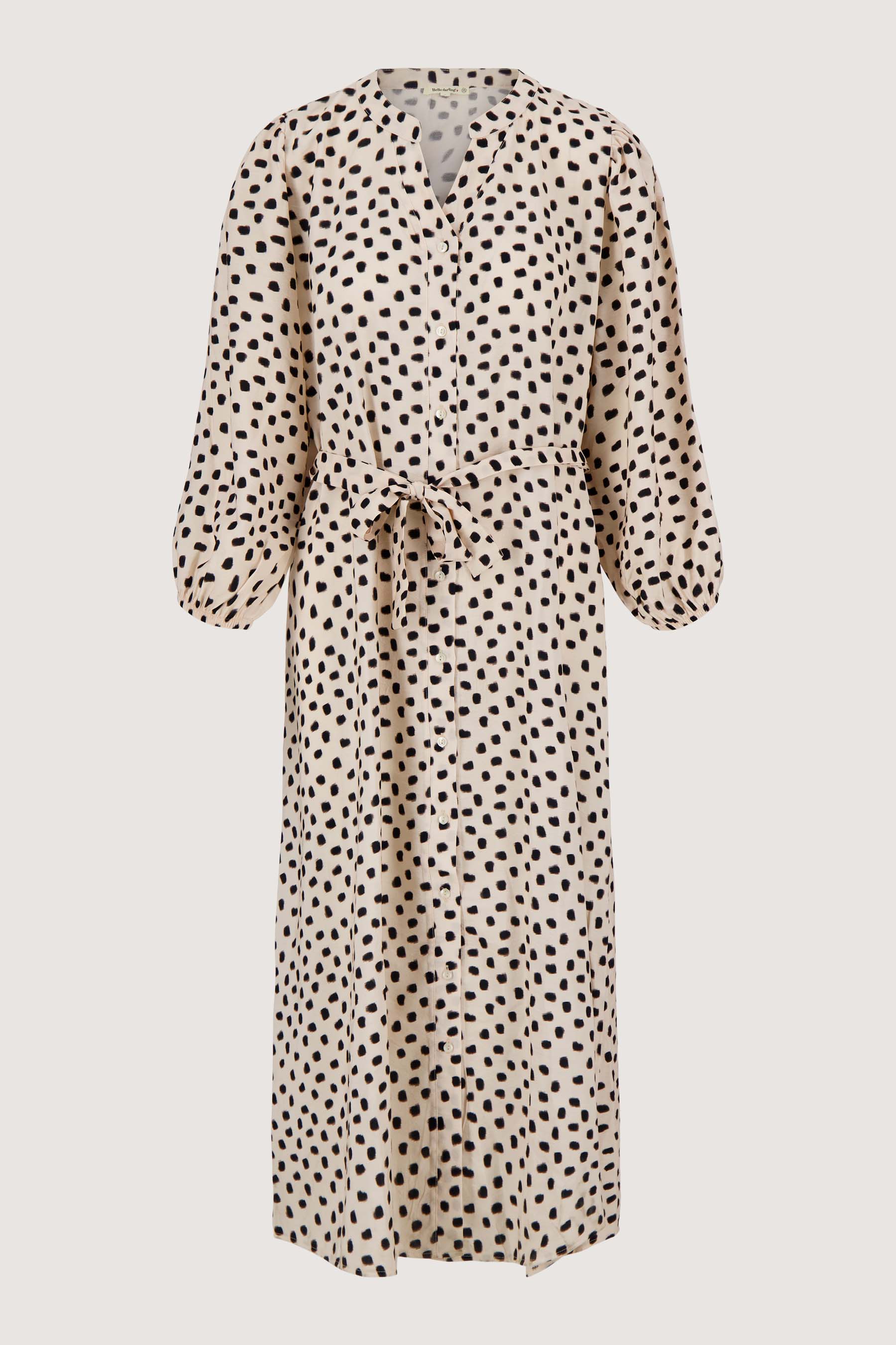 The Zusss dress with polka dot print is the perfect choice for a playful and elegant look. This short-sleeved dress is off-white with a black polka dot pattern that steals the show. The light fabric ensures a comfortable fit and a feminine look. With the Zusss dress with polka dot print, you are ready for any occasion, from a casual day to a stylish evening. Combine the dress with one of our blazers for a chic outfit.