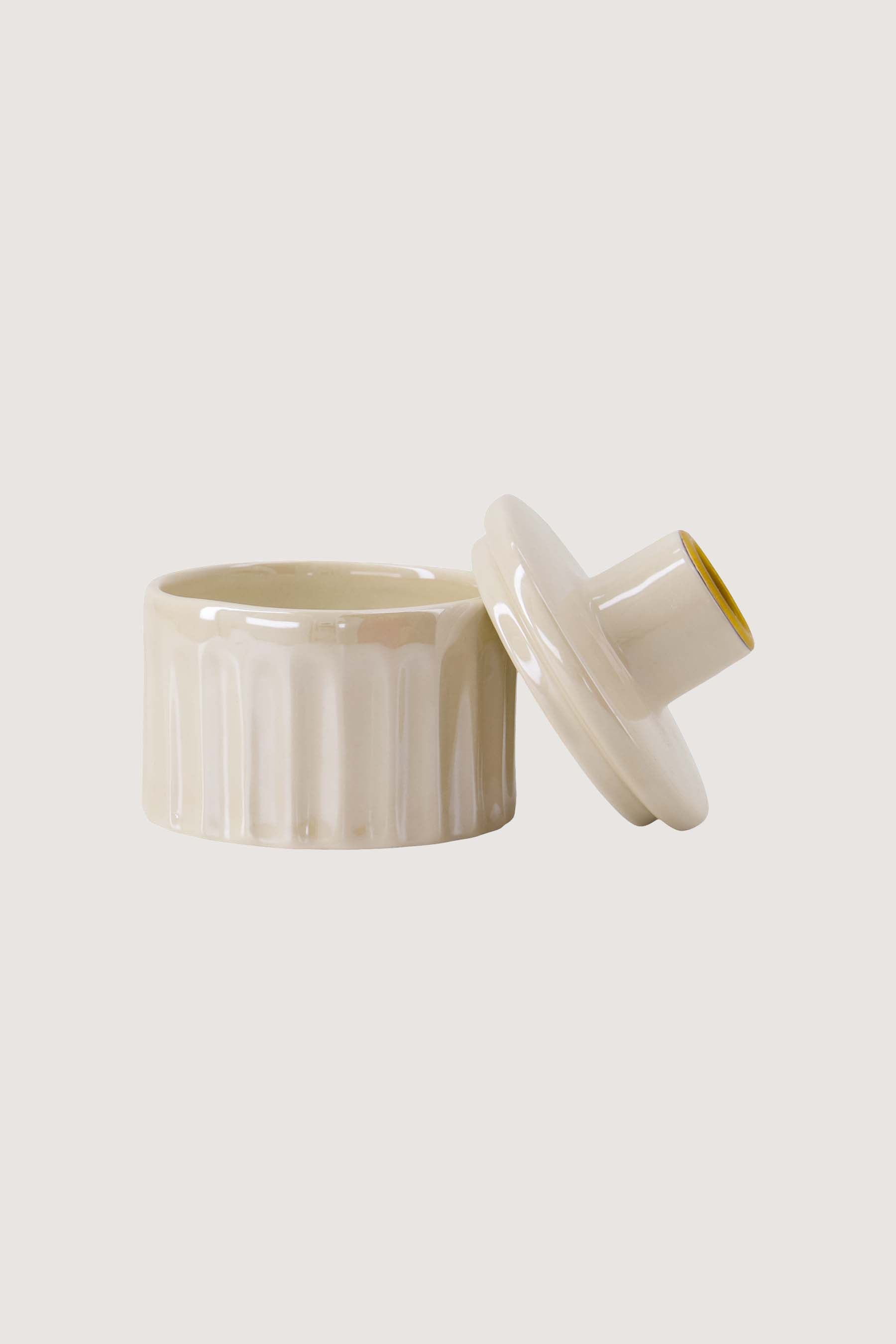 ceramic candle holder with mother-of-pearl ribbing and lid