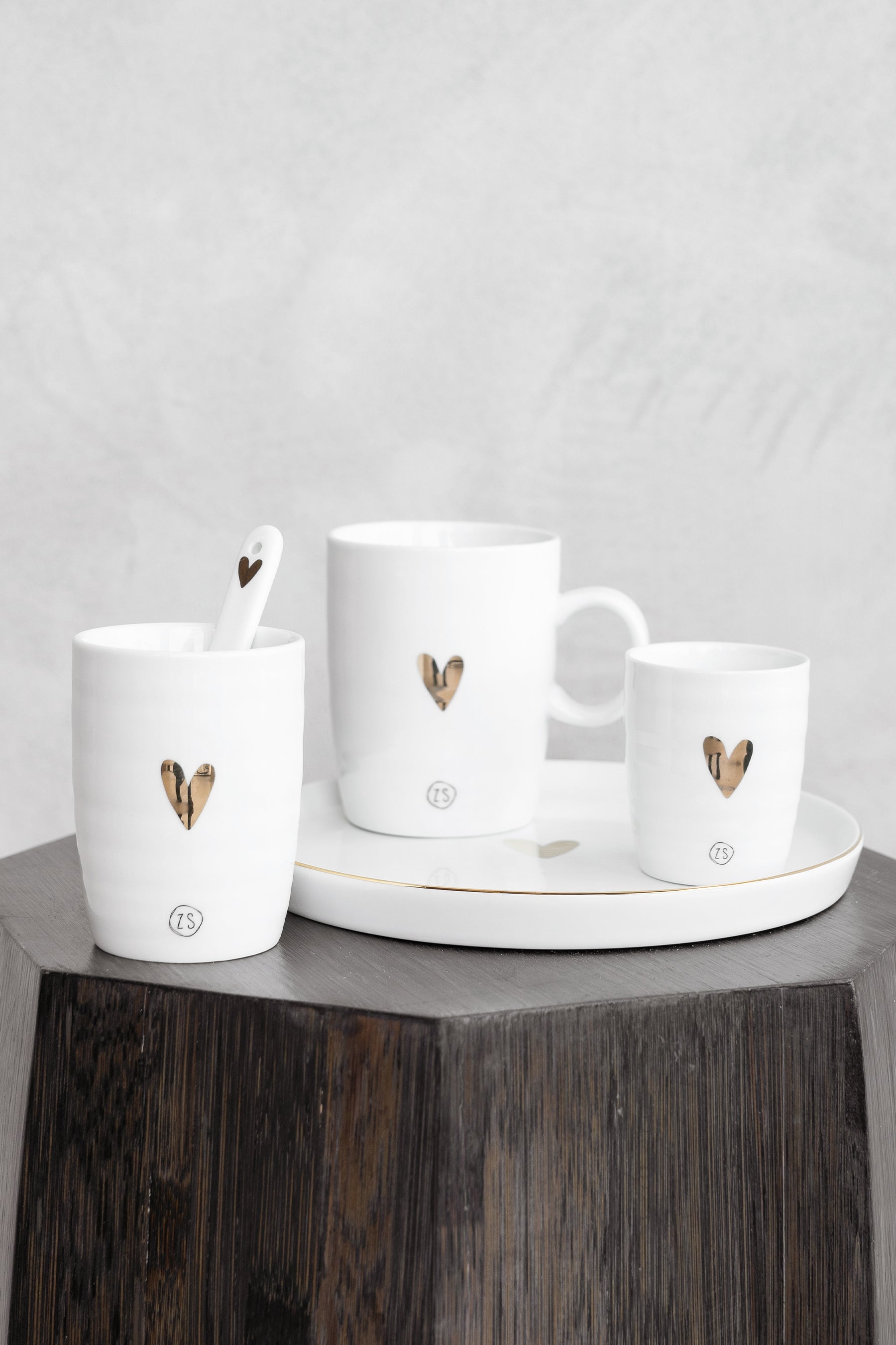 White spoon with a gold heart. Gold-glazed tableware cannot be washed in the dishwasher, so this spoon must also be washed by hand. The spoon is 14 cm long and has a small loop at the top, so you can store them together or hang them up by threading a string through the loop. The front features a gold heart and the back has a subtle Zusss logo. You will find matching items for the kitchen in the tableware category.