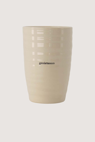 The Zusss sand mug is a must-have for your coffee break. This beautiful sand-colored mug with the text 'genietennn' (enjoy) exudes coziness. Made of high-quality ceramic, this mug has a fine texture and a capacity that is perfect for a large cup of coffee or tea. With its comfortable size, it fits effortlessly into your kitchen or office. This Zusss sand mug brings a warm and stylish moment of enjoyment every day. Combine the mug with one of our plates and bowls for a fun table setting.