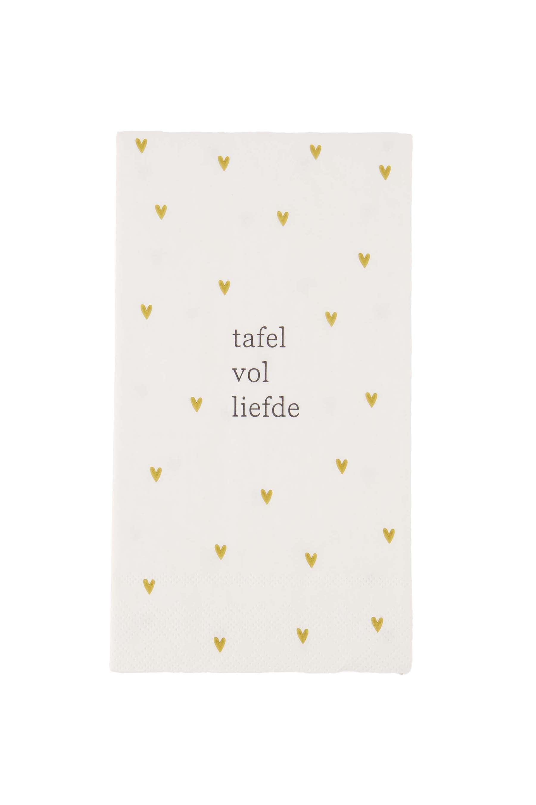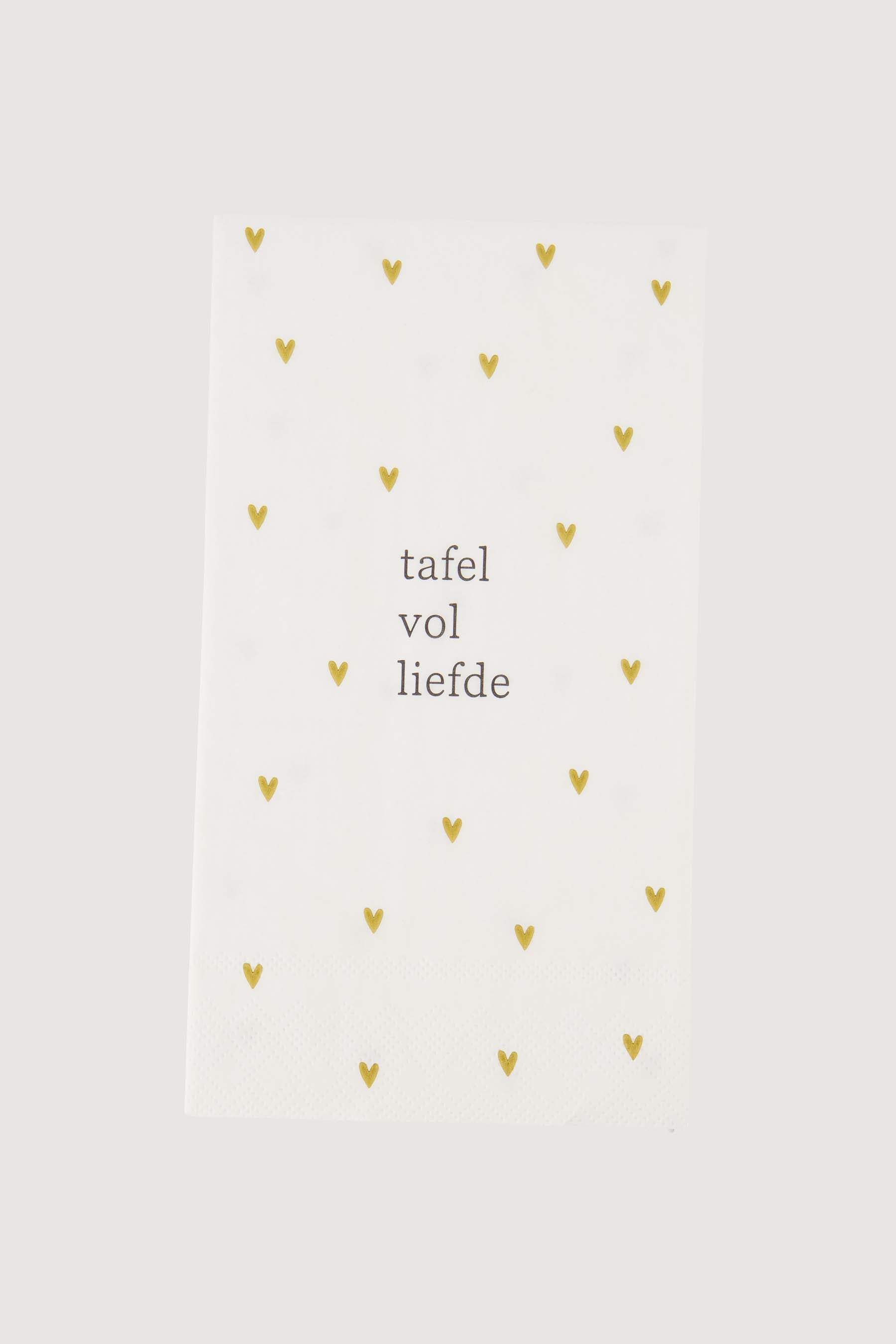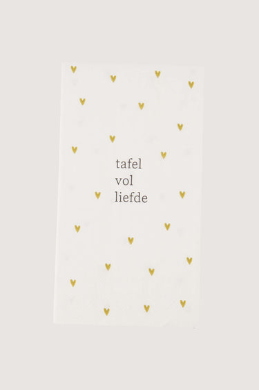These Zusss napkins with hearts complete your table and radiate a loving atmosphere. The napkins are white with ochre yellow hearts and the text "table full of love" on them. Made from high-quality paper for a nice touch, they measure approximately 16 x 30 cm, ideal for any occasion. With these napkins, you can add a warm accent to your table setting. Discover our glassware, cutlery, and home accessories for a perfect table setting full of love.