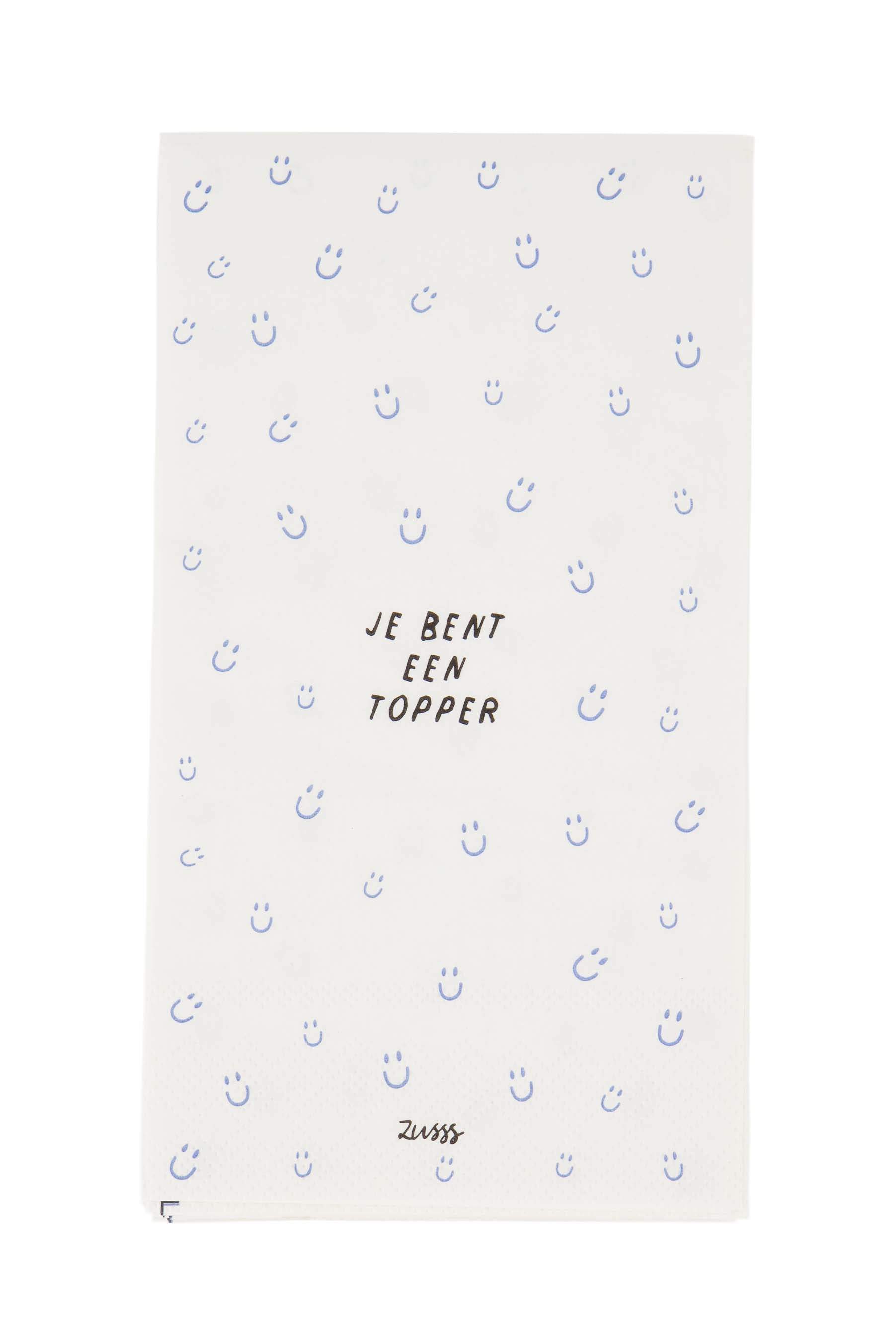 With these Zusss napkins you bring instant atmosphere to the table. The napkins with the playful 'You are a topper' design and cheerful blue faces make every meal cozier. The fresh white-blue color provides a natural look that fits perfectly in a contemporary kitchen. These Zusss napkins are ideal for everyday use or a spontaneous lunch. Thank you to the fine material they feel soft and are easy to combine with your other kitchen stuff.