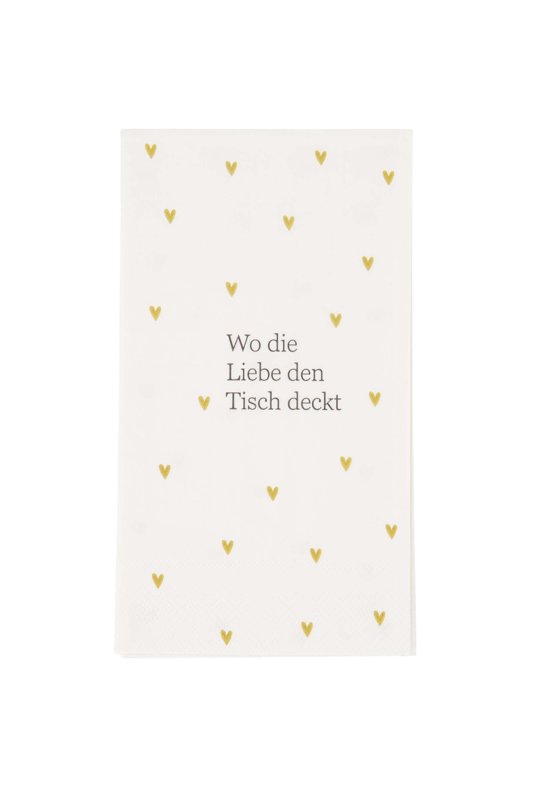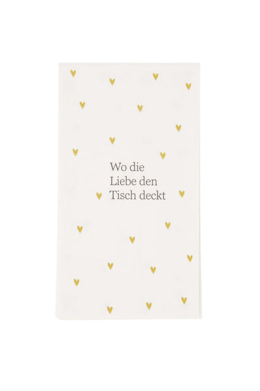 De Zusss servetten met goudaccenten maken je tafeldecoratie compleet en bijzonder. Deze rechthoekige servetten combineren een helder witte achtergrond met subtiele gouden hartjes en de liefdevolle tekst "Wo die Liebe den Tisch deckt." Zo creëer je met de Zusss servetten niet alleen een stijlvolle setting, maar ook een warme sfeer tijdens je diners of feestelijke gelegenheden. Gebruik ze voor je volgende etentje om een persoonlijke touch en elegantie toe te voegen. Ontdek meer sfeervolle servetten en tafeldecoratie in onze servetten collectie op zusss.nl.