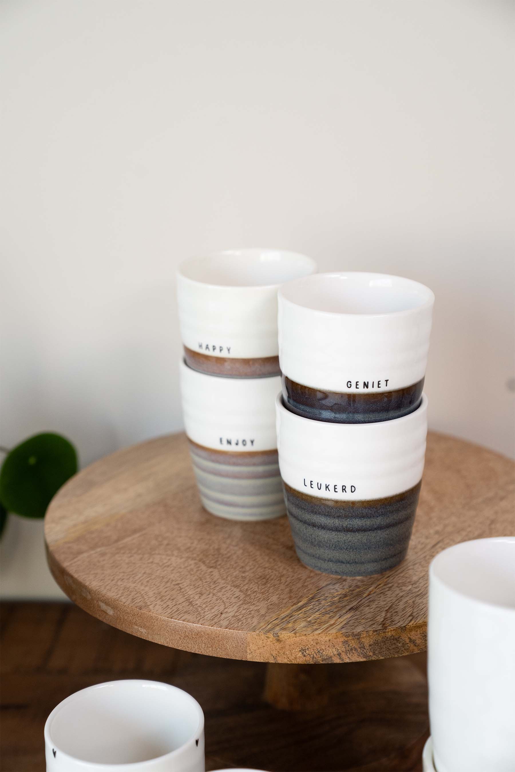 De Zusss koffiemokken set is perfect voor wie houdt van een momentje rust. Deze koffiemokken set combineert een witte bovenkant met een grijsblauwe, aardse onderkant, gemaakt van hoogwaardig keramiek. Met een afmeting die prettig in de hand ligt, passen ze moeiteloos in je dagelijkse ritueel. De set bevat twee mokken met de teksten 'geniet' en 'leukerd', ideaal om samen van je koffie te genieten. Ontdek meer handige items in onze servies collectie.