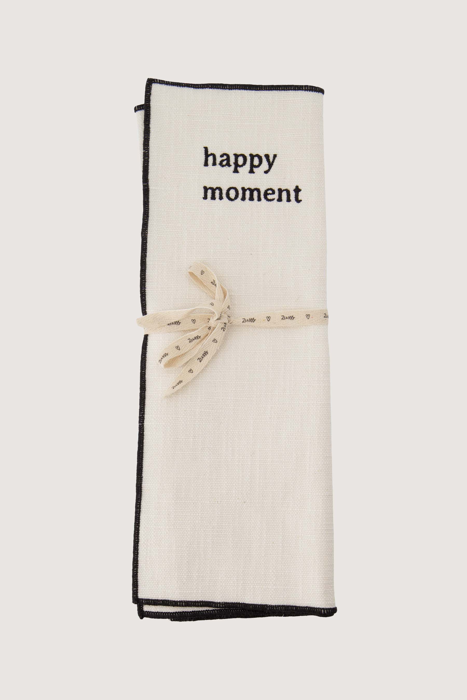 This Zusss placemat set in sand brings atmosphere to your dining table with a subtle texture and the 'happy moment' print. The placemats are made from 100% cotton, which gives them a natural look and feel. They are the perfect size, offering optimal protection against stains and heat. With their sand-colored hue and black border, these Zusss placemats fit effortlessly into any interior style. Combine them with other table textiles for a complete, cozy table setting.