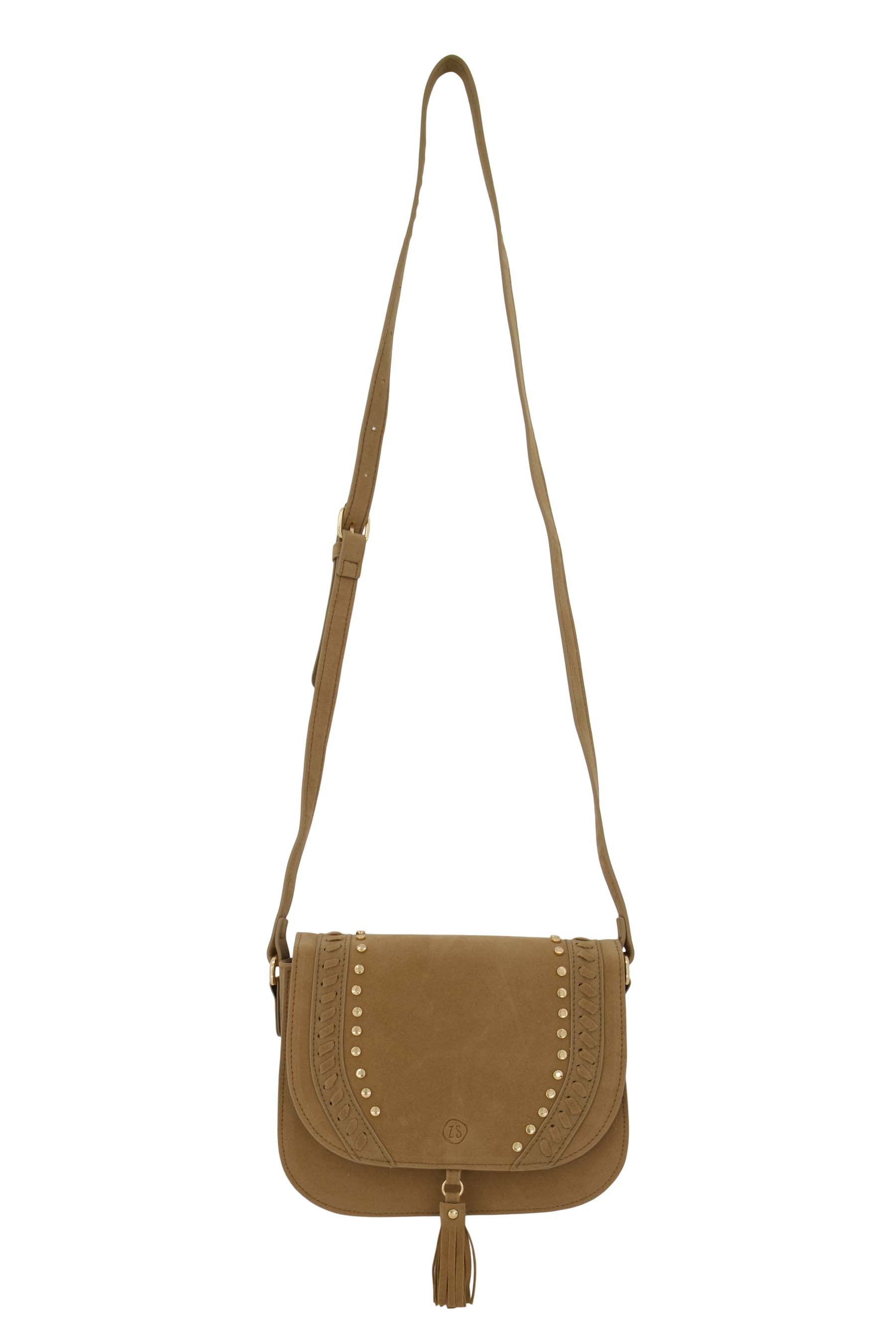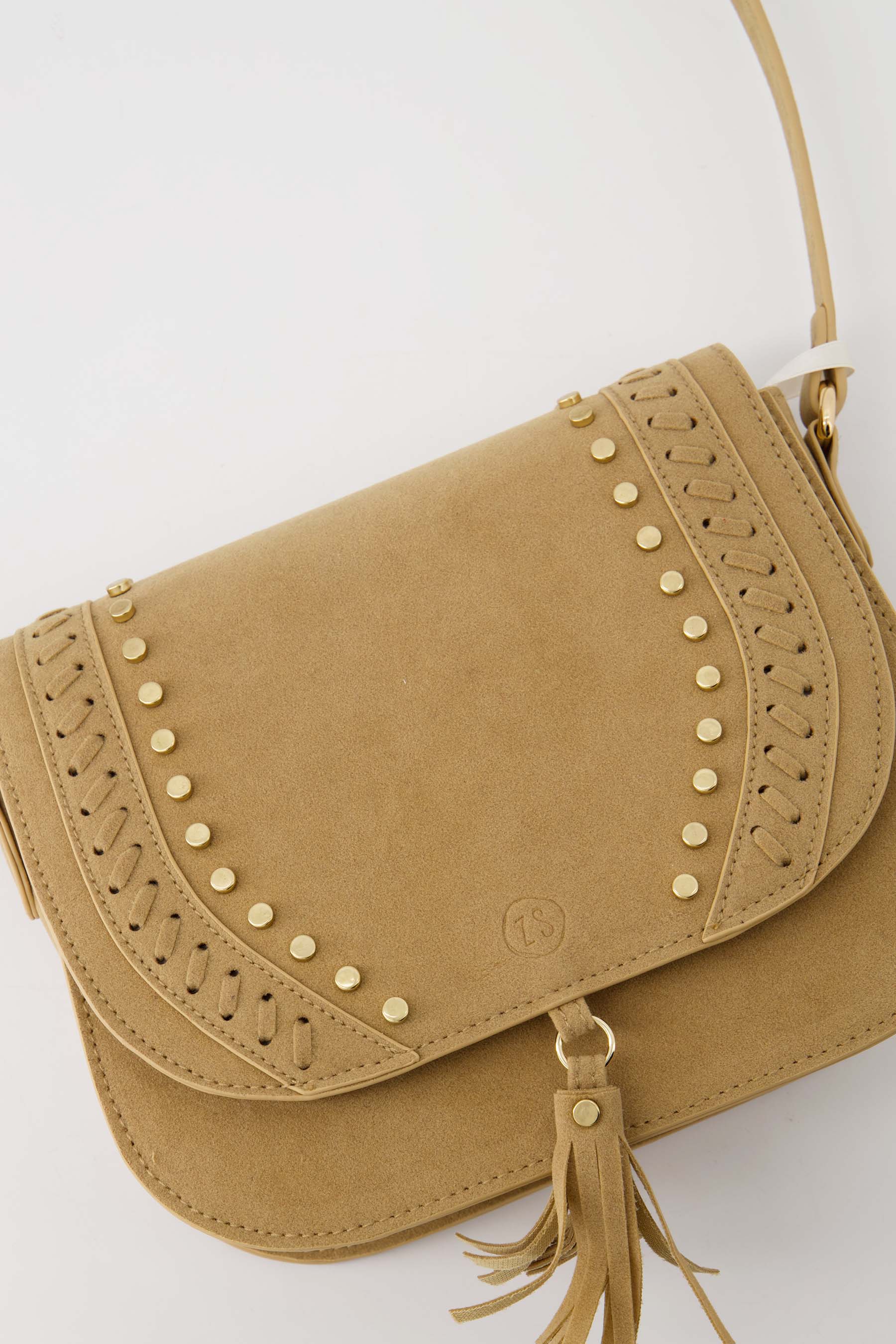 Deze Zusss schoudertas met studs combineert eenvoud met een subtiele stoerheid. De beige kleur geeft de tas een zachte, natuurlijke uitstraling. Met een nette flap met goudkleurige studs en een speels kwastje aan de voorkant is dit een perfect accessoire voor elke dag. De verstelbare schouderband zorgt voor draagcomfort. Deze tas past moeiteloos bij veel outfits en brengt jouw look helemaal af. Binnenin is de tas voorzien van een binnenvakje met ritssluiting, zodat je je kleine essentials veilig en overzichtelijk kunt opbergen.
