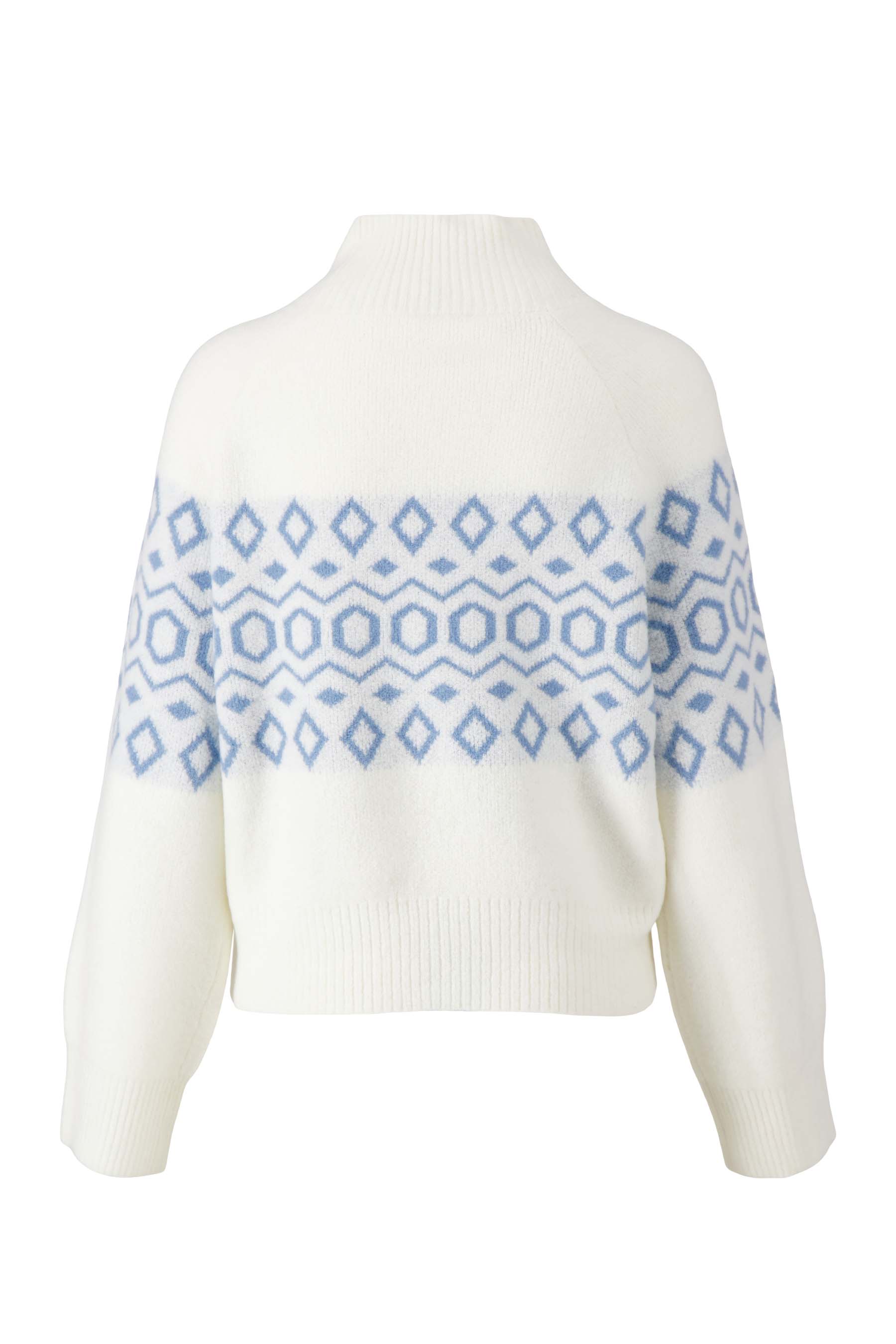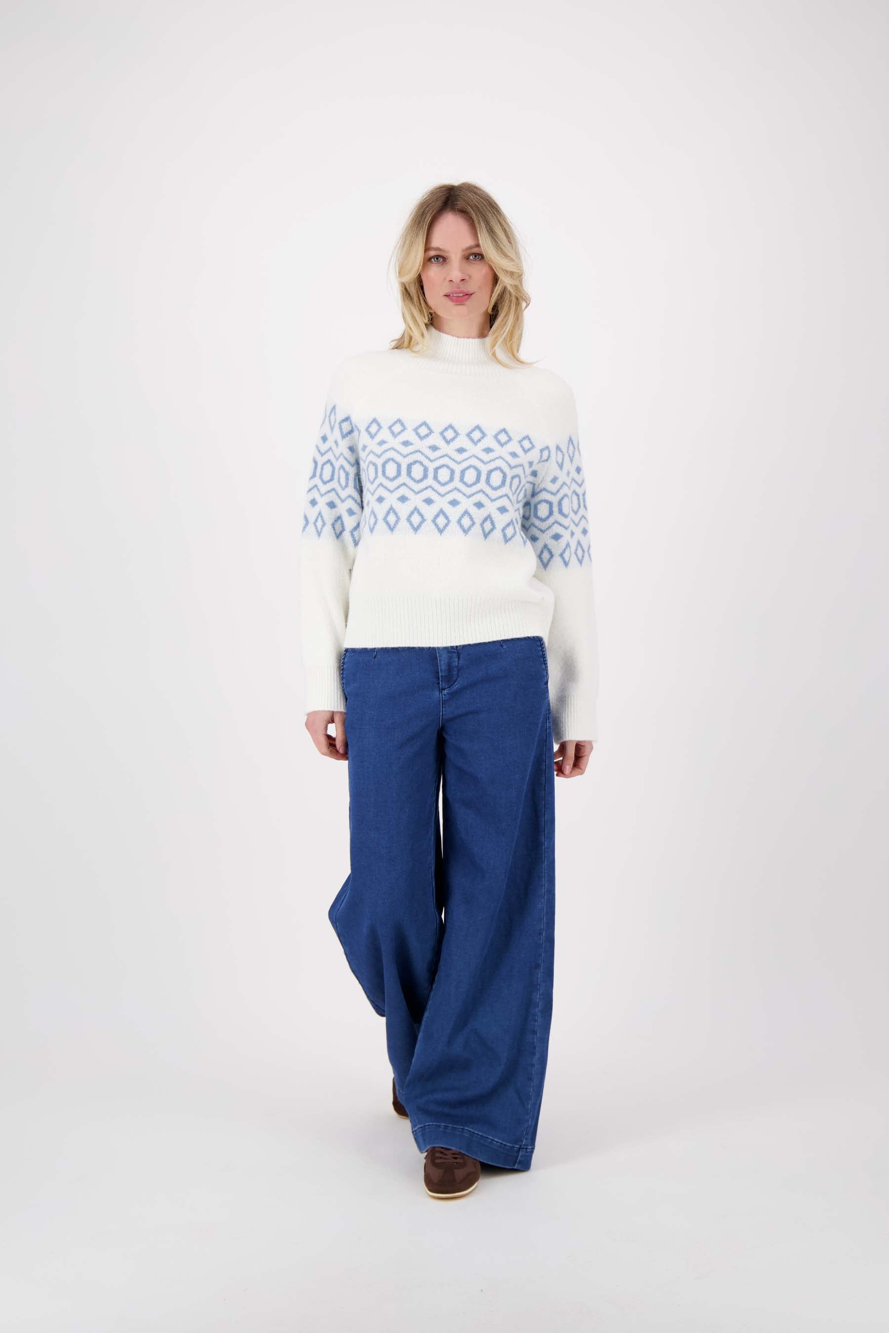 Deze trui met nordic jacquard van Zusss is perfect voor frisse dagen. De off white kleur met zachte blauwe jacquard print geeft een charmante, tijdloze uitstraling. De trui combineert stijl en comfort dankzij het zachte materiaal en de hogere hals, ideaal om warm te blijven. Een veelzijdige must-have in je garderobe, passend bij vele outfits. De nordic jacquard print maakt deze trui een subtiele eyecatcher in een warme, natuurlijke stijl.