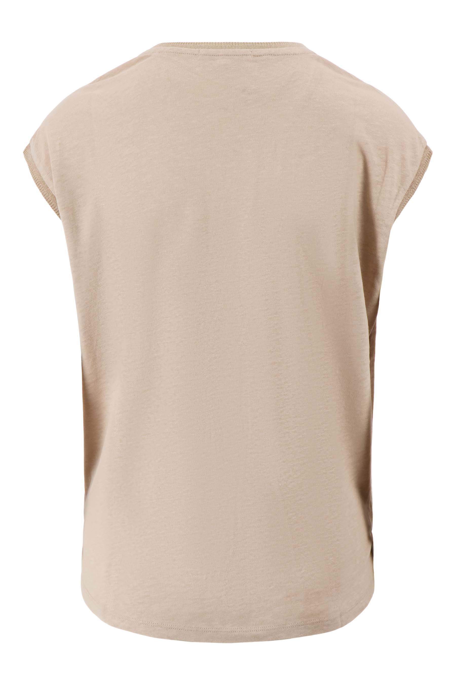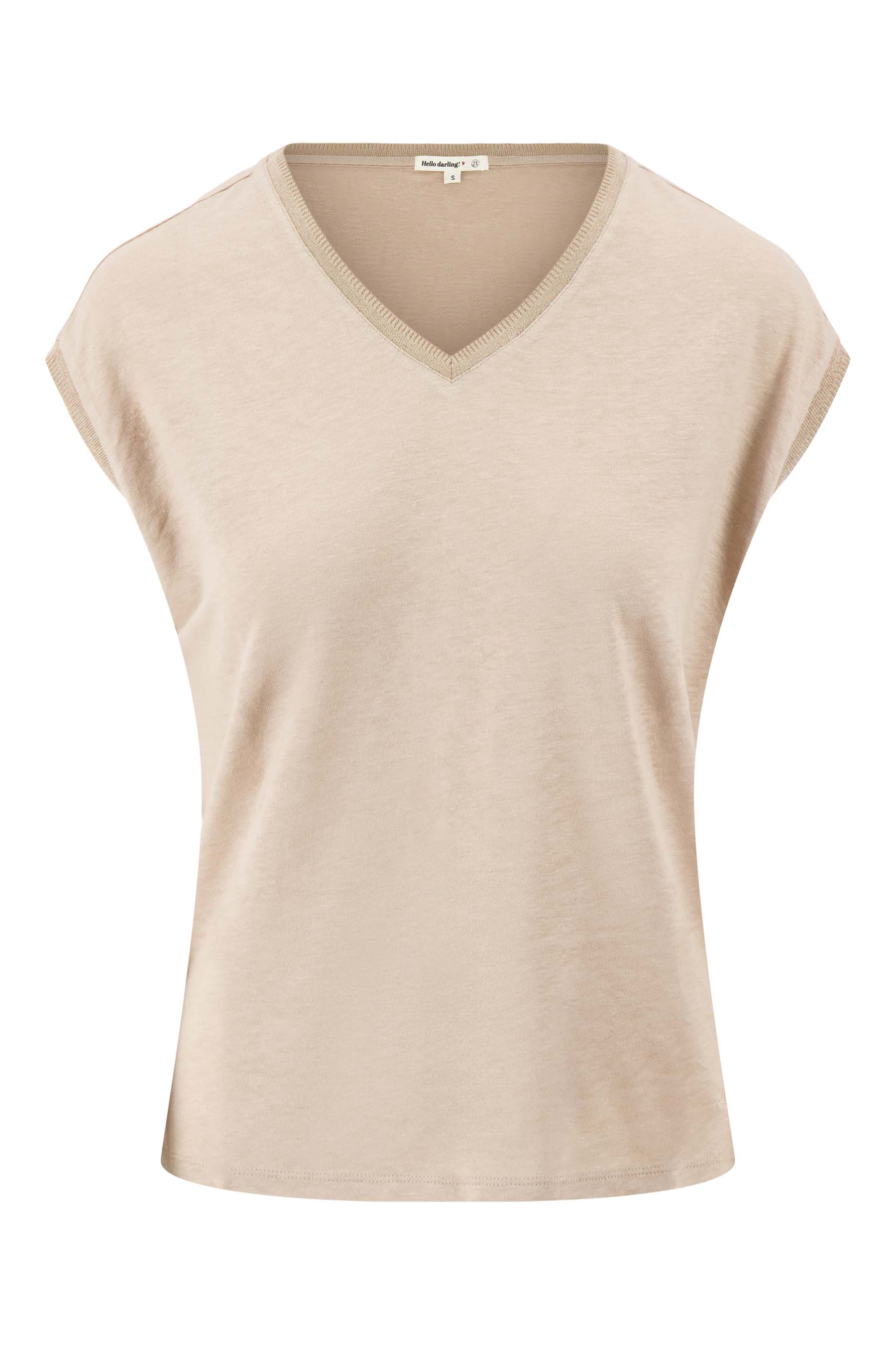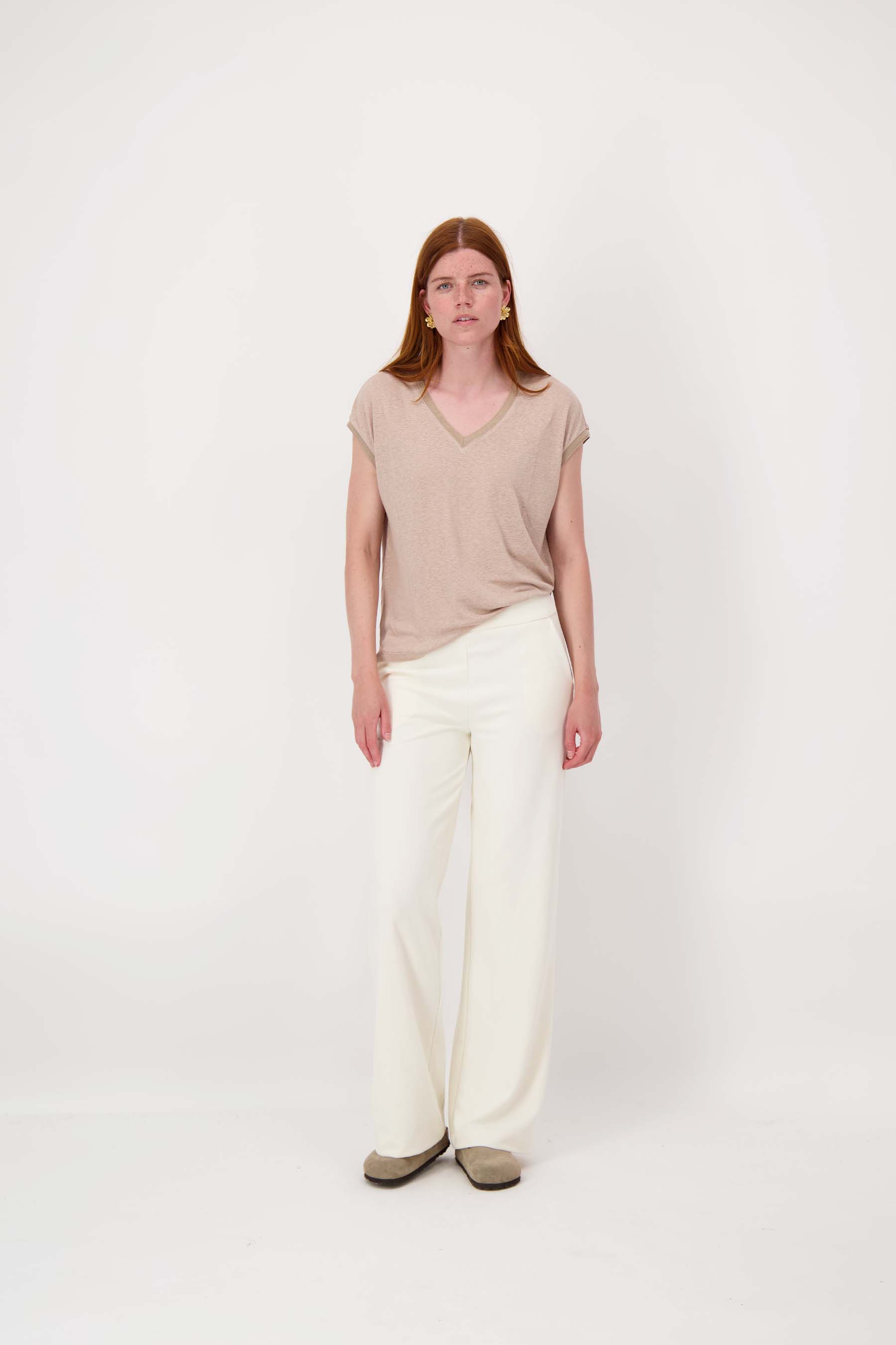 The Zusss V-neck top with lurex trim is a stylish must-have for your casual wardrobe. This top stands out thanks to the subtle lurex trim around the V-neck and short sleeves, which add a subtle touch of glitter. The top has a comfortable fit and comes in the color darker sand, a warm, soft shade that is easy to combine. Pair the V-neck top with one of our jersey dresses for a fun look.
