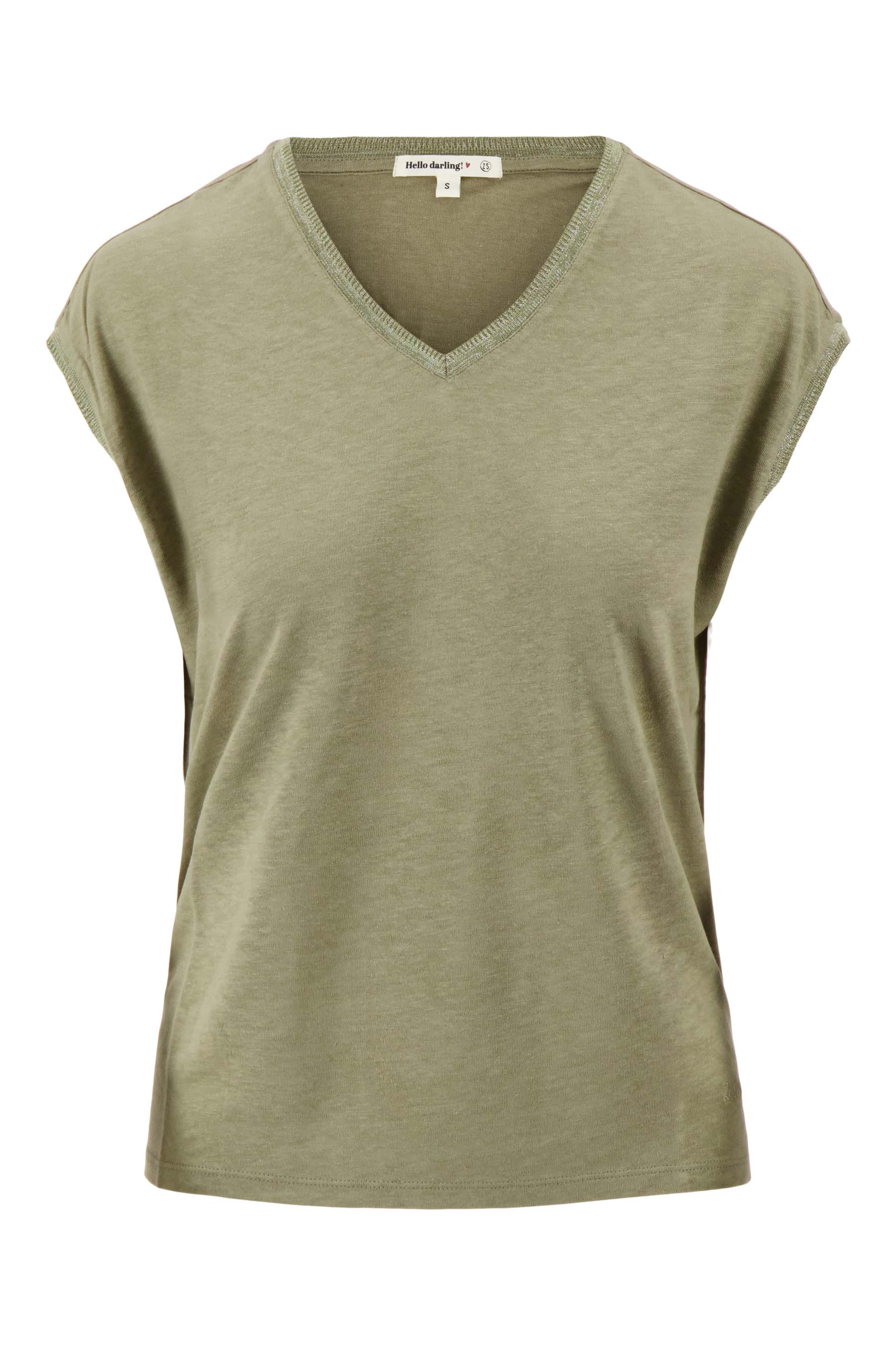 The Zusss V-neck top with lurex trim is perfect for a playful and stylish outfit. This top stands out thanks to the subtle lurex trim at the V-neck and short sleeves, which adds a chic touch. The light moss green color creates a natural, soft look that is easy to combine. This V-neck top with lurex trim is a great addition to your wardrobe and is wonderfully wearable. Combine this V-neck top with one of our between-seasons jackets for a chic look.