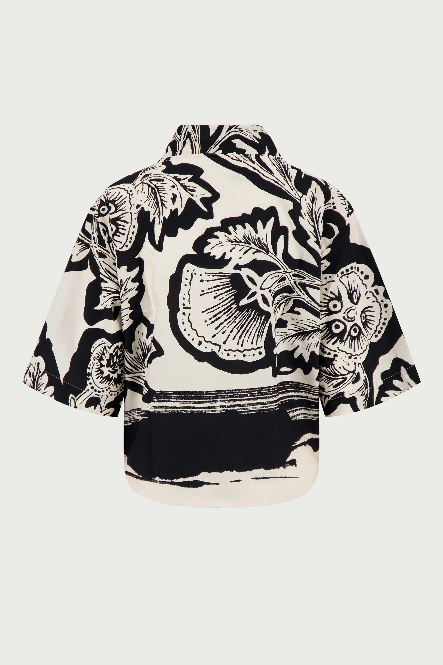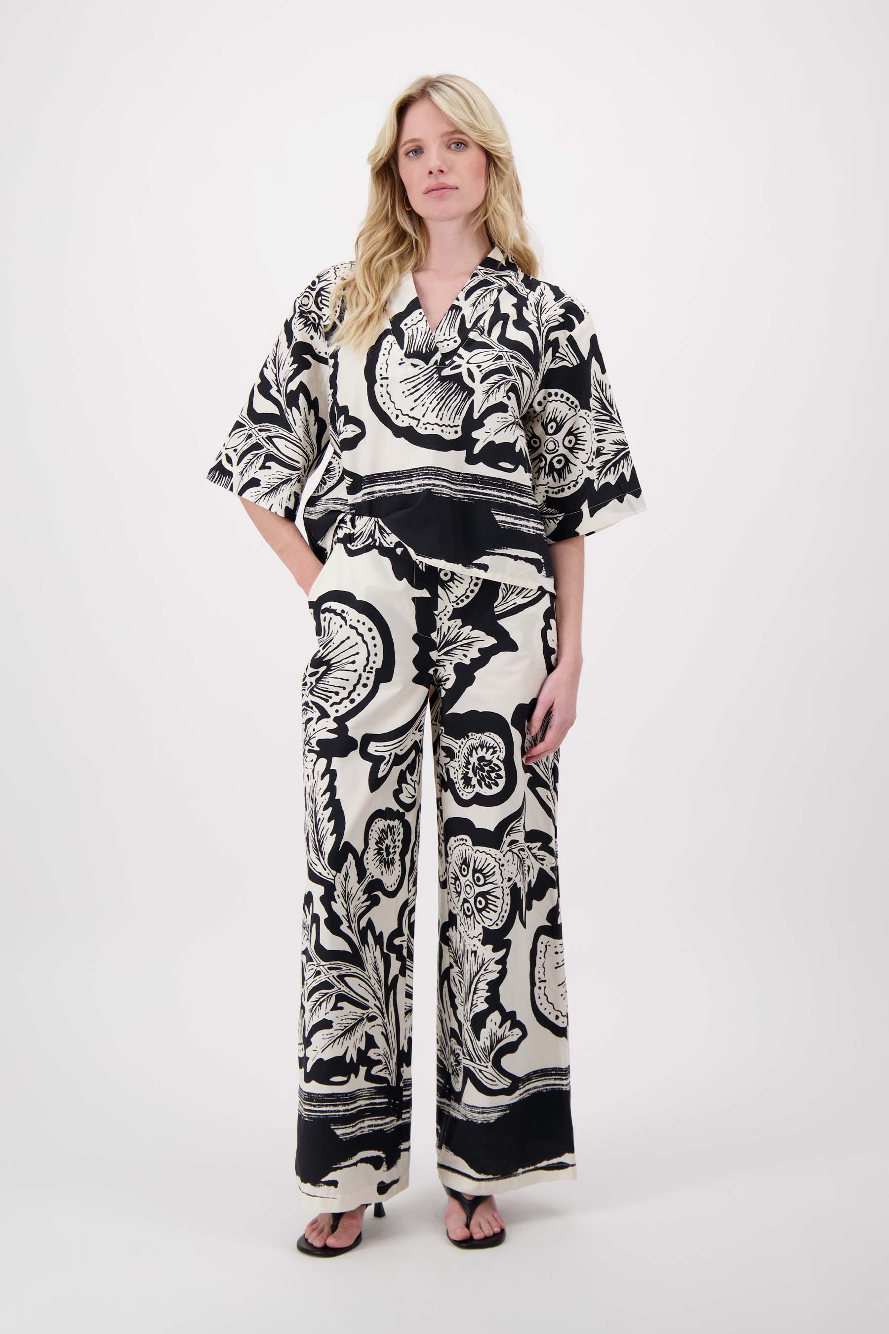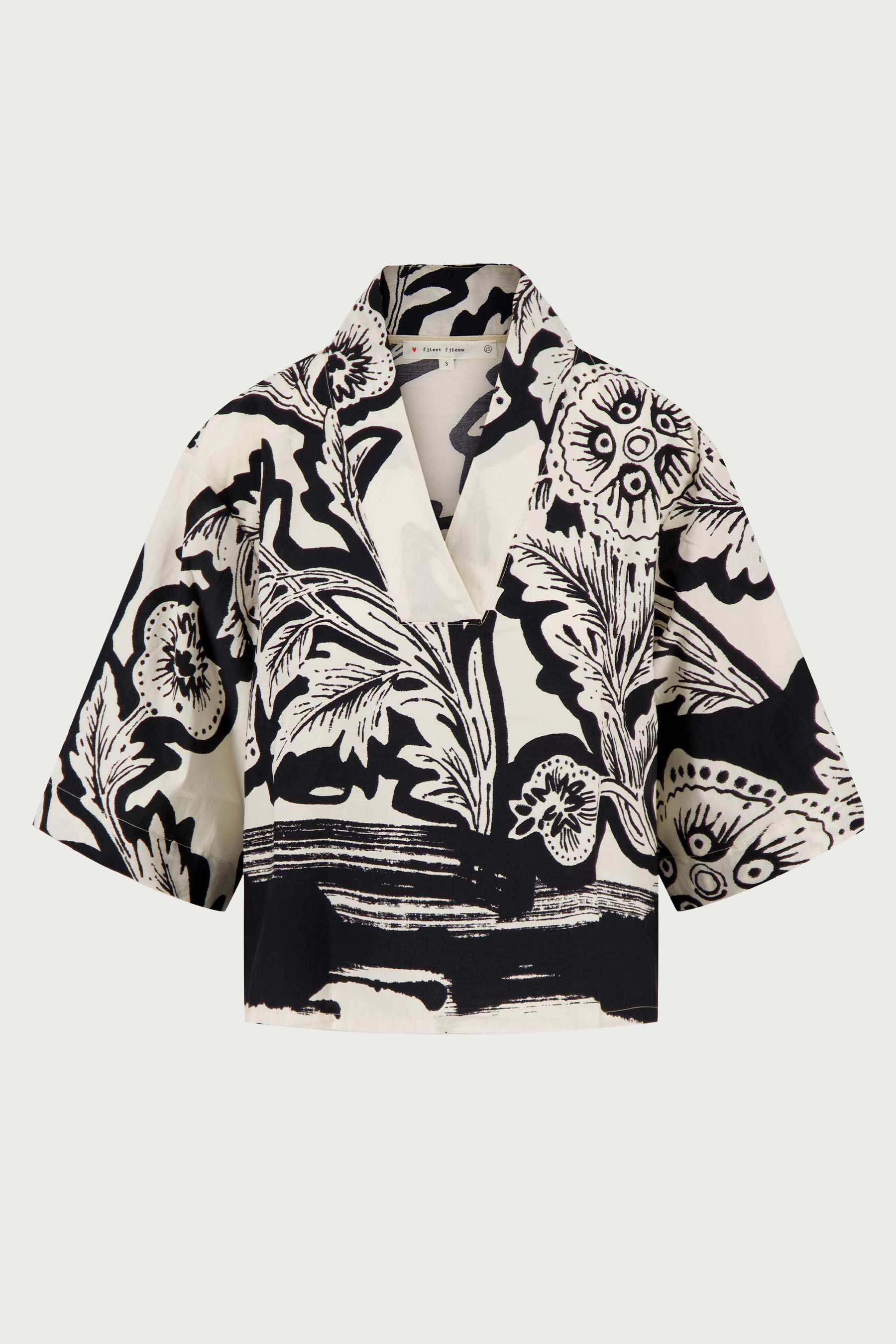 Deze blouse met V-hals en borderprint van Zusss is een frisse toevoeging aan je garderobe. De zwarte en soft kit kleuren vormen samen een opvallend, artistiek patroon dat elke outfit direct een speelse twist geeft. Dankzij de korte mouwen en de luchtige stof is deze blouse ideaal voor warme dagen, terwijl de ruime pasvorm zorgt voor comfort zonder in te boeten aan stijl. Combineer hem moeiteloos met jeans of een rok uit onze blouses & tops collectie voor een natuurlijke, toch verrassende look.