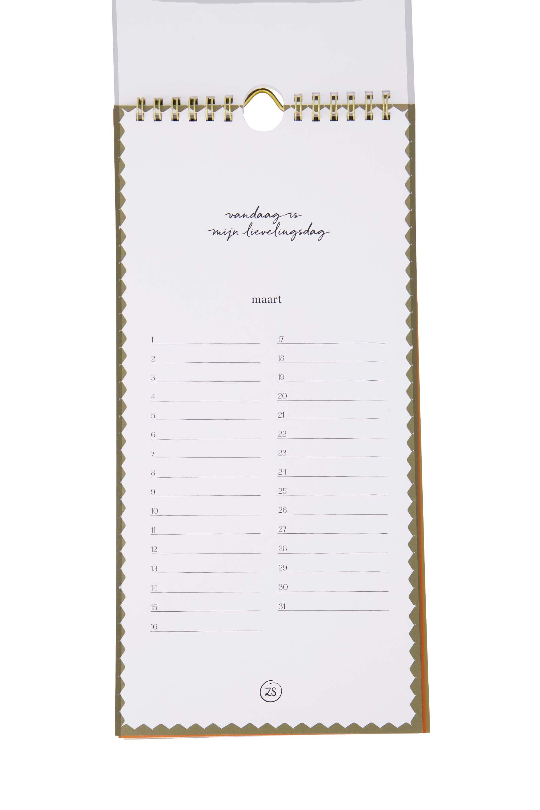 Deze Zusss verjaardagskalender brengt rust in je planning. Met de lievelingsdag verjaardagskalender houd je alle speciale dagen overzichtelijk bij, zodat je nooit meer een verjaardag vergeet. De zachte linnen kleur en het fijne reliëf geven de kalender een warme, natuurlijke uitstraling. Dankzij het handige formaat past hij perfect aan elke muur en is hij makkelijk bij te houden. Of je hem thuis of op kantoor hangt, deze verjaardagskalender van Zusss helpt je de belangrijke momenten van je dierbaren te onthouden, zonder gedoe.