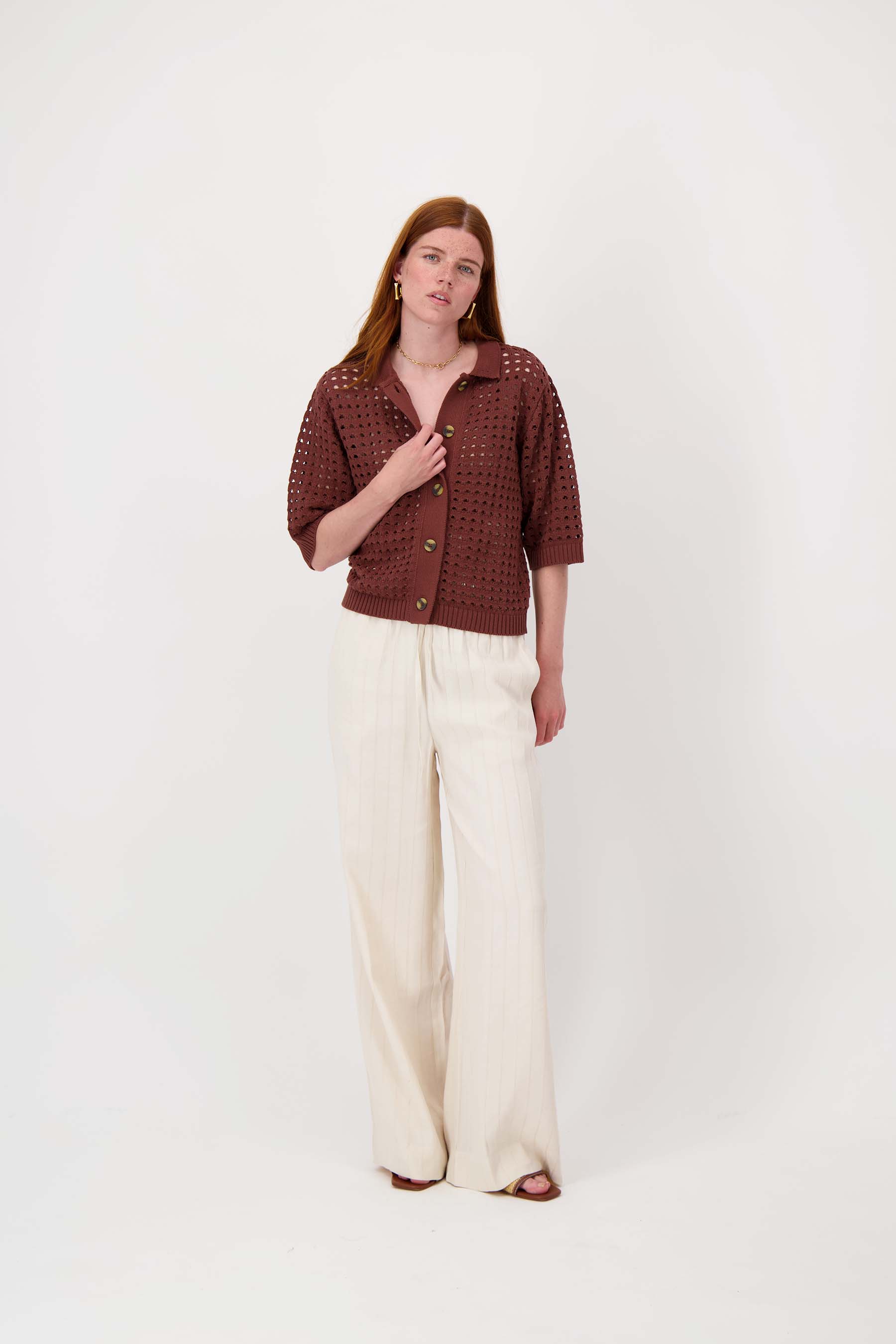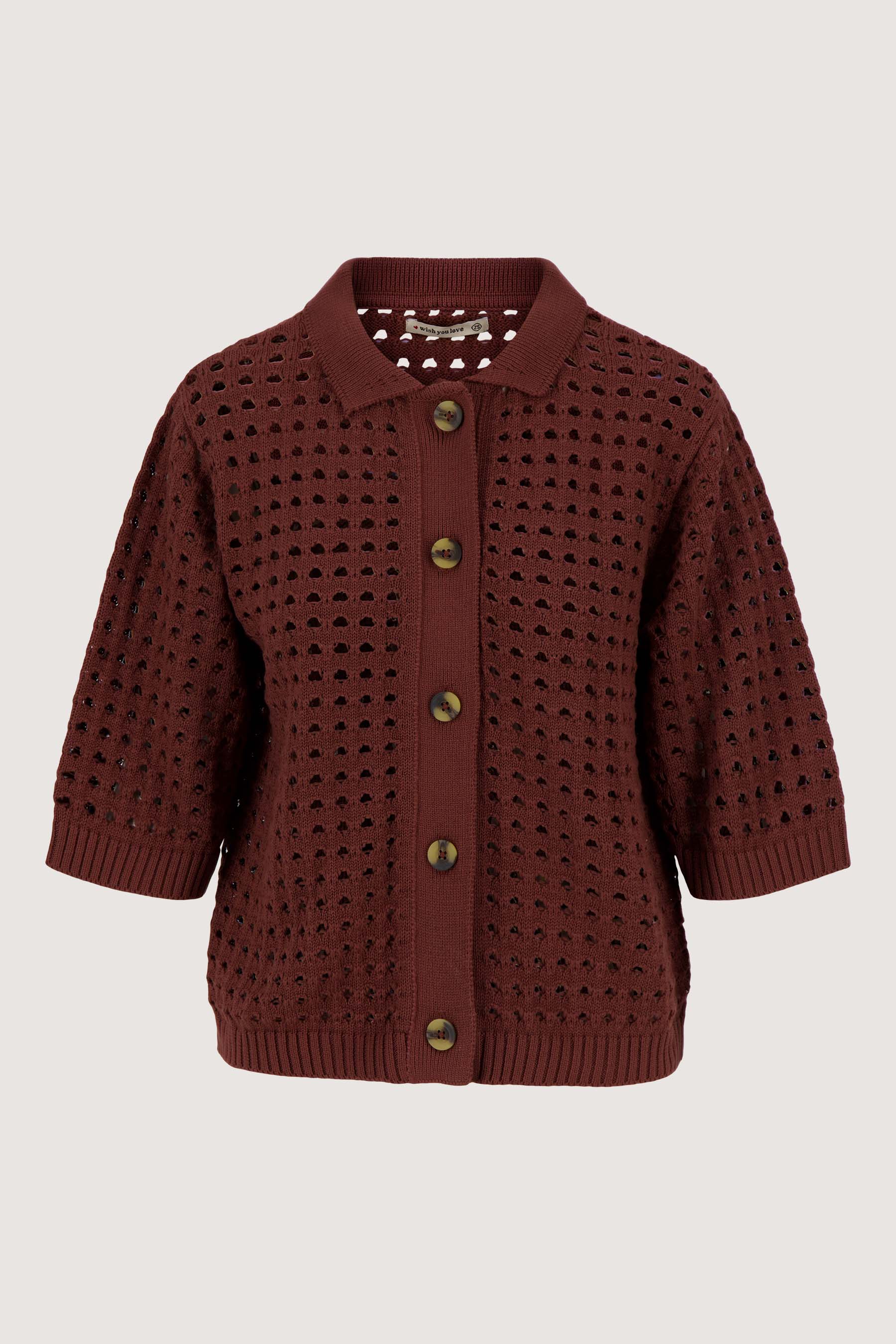 The Zusss cardigan with polo collar is a stylish must-have thanks to its airy openwork design. This cardigan with polo collar gives your outfit a soft, feminine touch thanks to its openwork pattern. The cardigan comes in a warm mid-brown shade, perfect for combining with light or neutral colors. Thanks to its short sleeves and button closure, the cardigan with polo collar is ideal for cool spring days or as an extra layer in winter. Discover even more great items in our collection. Pair this cardigan with one of our gloves so you're all set for the colder days.
